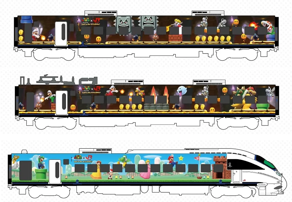 นอกจากนั้นรถไฟด่วนพิเศษของ JR Kyushu อย่าง Relay Kamome, Kasasagi, Kirameki, Midori และ Sonic ก็ได้รับการแปลงโฉมเป็นธีม Mario เช่นกัน โดยมีงานศิลปะที่ออกแบบให้เหมือนด่านเกมแบบเลื่อนข้าง พร้อมฉาก Mario กระโดดแตะเสาธงตอนจบ