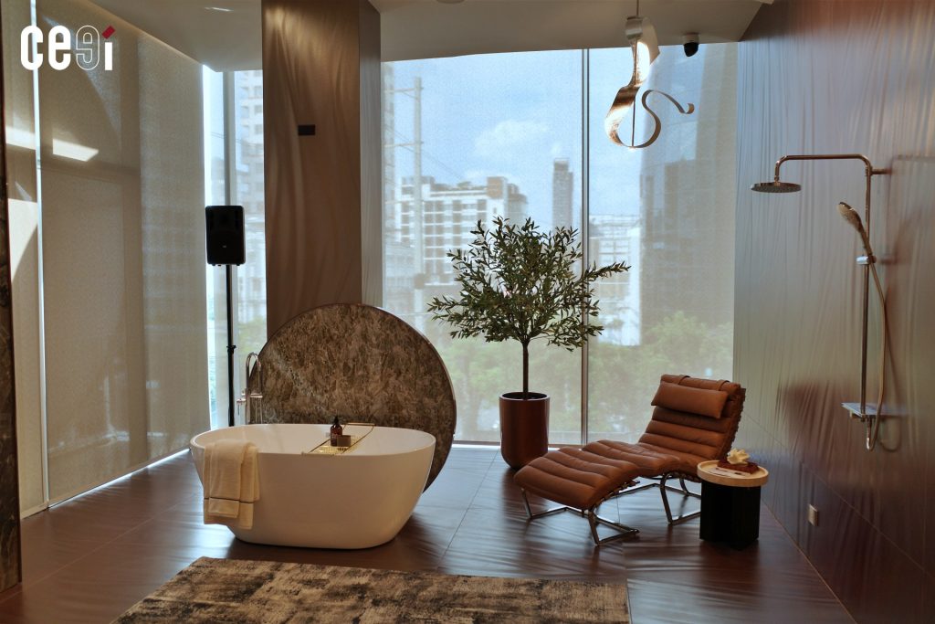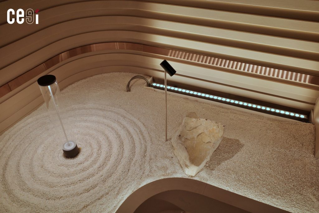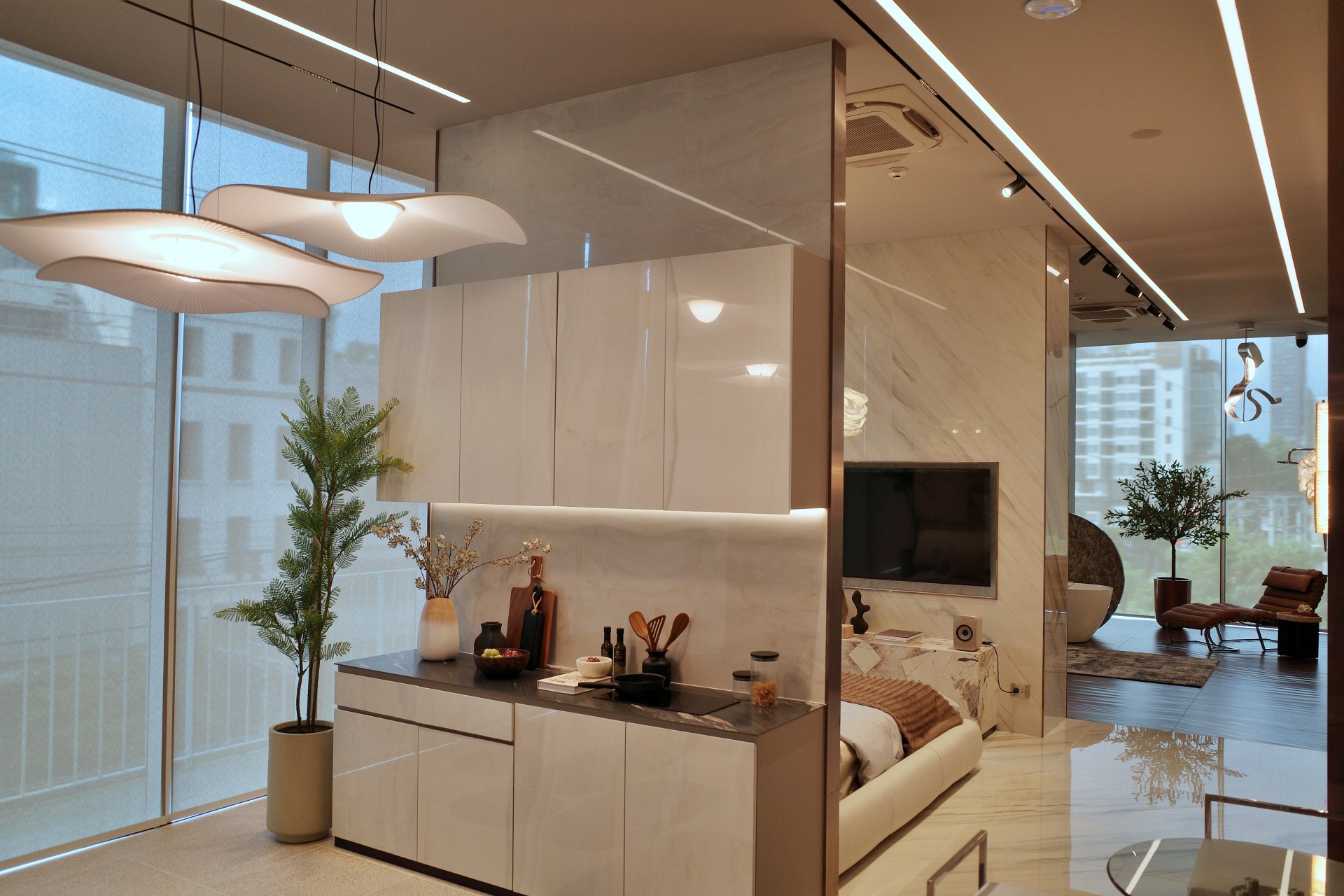 ภายในโชว์รูมมีการแบ่งโซนตัวอย่างให้เห็นการใช้งานจริง ทั้งโซนห้องนั่งเล่น, ห้องครัว, ห้องน้ำ, ห้องนอน หรือห้องชมภาพยนตร์ ซึ่งแต่ละโซนจะมีการตกแต่งด้วยงานหินจาก EvoStone by Fiandre นำเข้าจากอิตาลี ซึ่งมีเทคโนโลยี Active Surface สามารถฆ่าเชื้อและทำความสะอาดตัวเองอัตโนมัติได้ พร้อมเฟอร์นิเจอร์จาก HALO ที่ออกแบบแบบ Modular Design เพื่อให้เข้ากับห้องได้หลายรูปแบบ