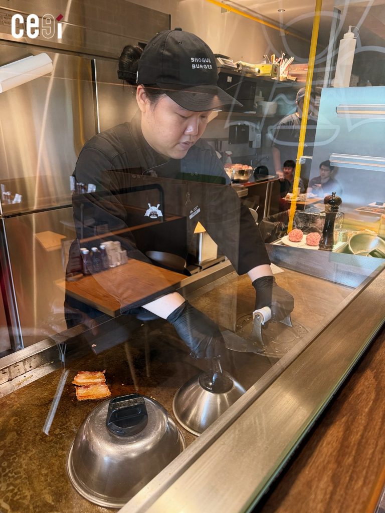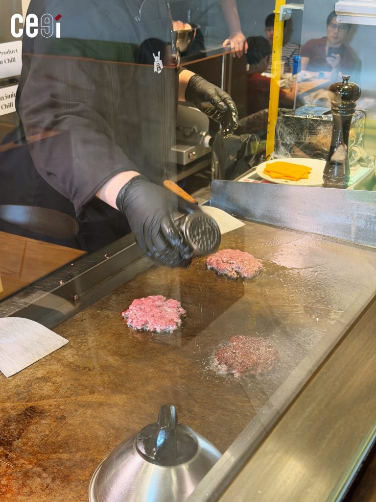 ความลับที่ทำให้ Daishogun Burger แตกต่างและครองใจคนรักเนื้อ คือการพิถีพิถันคัดสรรวัตถุดิบ โดยทางร้านเลือกใช้เนื้อวากิวระดับ A4 ส่งตรงจากญี่ปุ่น โดยจะขึ้นบอร์ดหน้าร้านว่าใช้เนื้อจากแหล่งผลิตไหน จุดเด่นที่น่าสนใจคือการเลือกใช้เนื้อส่วนต้นขาหรือ Shank ที่มีเอ็นเยอะ ผสมกับเนื้อส่วนอื่น นำมาย่างด้วยเทคนิคสแมชเบอร์เกอร์ (Smash Burger) ผ่านการกดเนื้อลงบนกระทะร้อน ๆ แต่เคล็ดลับของทางร้านคือการไม่กดเนื้อจนบางเกินไป เพื่อคงความหนาและเก็บรักษาความชุ่มฉ่ำของเนื้อวากิวเอาไว้ให้ได้มากที่สุด