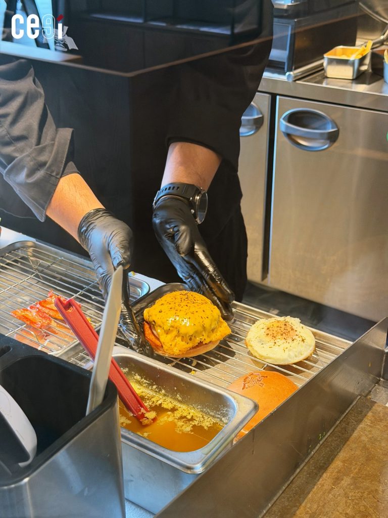 นอกจากตัวเนื้อที่โดดเด่นแล้ว องค์ประกอบอื่นก็ถูกประกอบขึ้นมาอย่างใส่ใจ ทางร้านนำขนมปังไปกริลล์บนกระทะจนได้สีทองสวยงาม ทำให้ผิวสัมผัสด้านนอกกรอบแต่ด้านในยังคงความนุ่ม เมื่อประกบเข้ากับเนื้อวากิวที่ท็อปด้วยเชดดาร์ชีสแท้อบจนละลาย ก็ยิ่งดึงรสชาติความอร่อยออกมาได้อย่างเต็มเปี่ยม