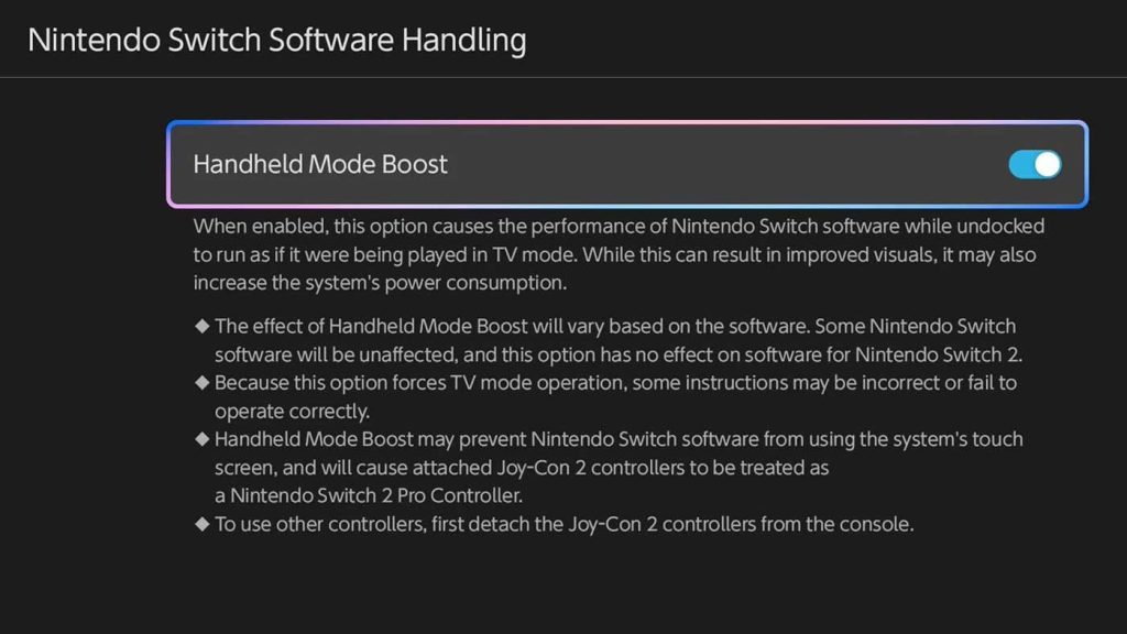 เนื่องจากความละเอียดในโหมดพกพาของ Nintendo Switch รุ่นก่อนจำกัดอยู่ที่ 720p ในขณะที่หน้าจอของ Switch 2 รองรับความละเอียด 1080p ดังนั้นโหมด Handheld Boost จะทำให้เกมของ Nintendo Switch รุ่นแรก สามารถรันในโหมดพกพาได้ “เสมือนเล่นบนทีวี”