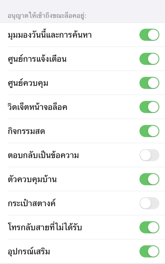 4. ในหัวข้ออนุญาตให้เข้าถึงขณะล็อกอยู่ (Allow Access When Locked) เลื่อนฟีเจอร์ที่ต้องการปิดการทำงานที่กล่าวไว้ด้านบน ซึ่งการปิดนั้นจะไม่ส่งผลกระทบต่อการแจ้งเตือนบนหน้าจอ แต่เราไม่สามารถโต้ตอบได้ หากไม่ปลดล็อกหน้าจอเท่านั้น ซึ่งจะช่วยให้เราปลอดภัยและมีความเป็นส่วนตัวมากขึ้น