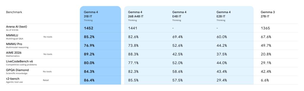 ในด้านความสามารถ Gemma 4 เปิดตัวทั้งหมด 4 ขนาด ได้แก่ E2B, E4B, 26B แบบ Mixture of Experts และ 31B แบบ Dense ซึ่งครอบคลุมตั้งแต่งานบนอุปกรณ์พกพาไปจนถึงงานระดับองค์กร โดยเฉพาะรุ่น 31B ที่ติดอันดับต้น ๆ ของโลกในด้านการประมวลผลข้อความ และรุ่น 26B ที่เน้นความเร็วด้วยการใช้พารามิเตอร์อย่างมีประสิทธิภาพ ทำให้สามารถให้ประสิทธิภาพสูงแม้ใช้ทรัพยากรน้อยกว่าโมเดลขนาดใหญ่หลายเท่า