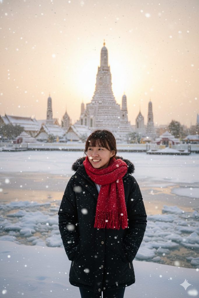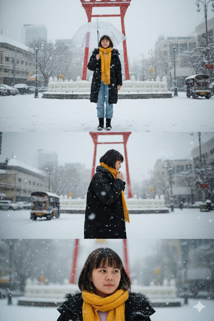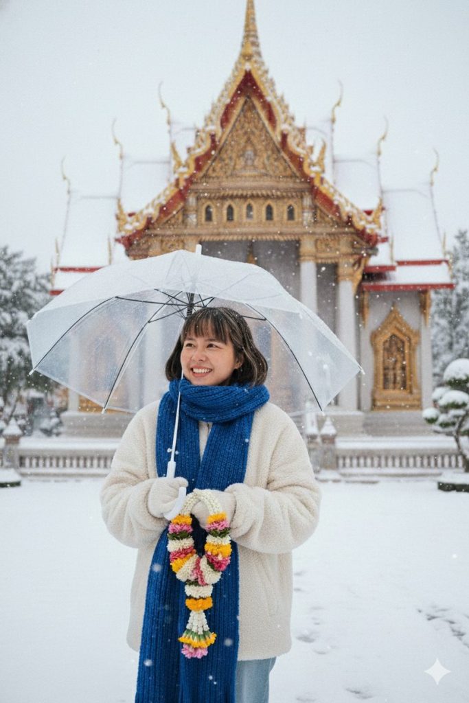 สร้างรูปภาพจากรูปภาพอ้างอิง โดยให้ใส่ชุดกันหนาวสีดำ ผ้าพันคอสีเหลือง ยืนท่ามกลางหิมะ ฉากหลังเป็นเสาชิงช้าแลนด์มาร์คในกรุงเทพฯ มีรถตุ๊กตุ๊ก ออกเป็น 3 ช่องแนวนอนเรียงกันลงมาดังนี้ ภาพแรก ยืนตรงกลางเห็นเต็มตัว หน้ายิ้มนิดๆ ถือร่มสีใส ภาพที่ 2 ยืนหันข้างภาพครึ่งตัว หันข้าง ทำท่าจับผ้าพันคอ ภาพที่ 3 โคลสอัพ เห็นสีหน้าและแววตาชัดเจน