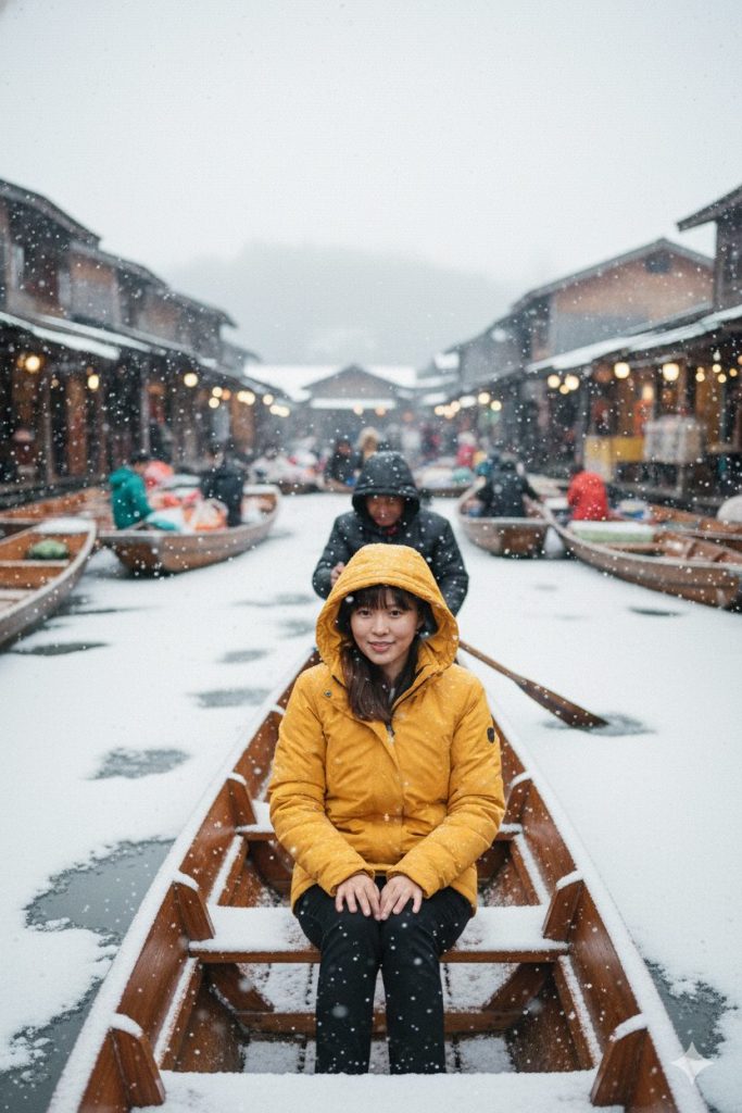 สร้างรูปภาพจากรูปภาพอ้างอิง ใส่ชุดกันหนาวสีเหลืองแบบฮู้ด ภาพมุมกว้างนั่งอยู่ในเรือที่ตลาดน้ำที่กำลังมีคนพายเรือ หิมะกำลังตก ผิวน้ำของแม่น้ำเป็นน้ำแข็งบางๆ