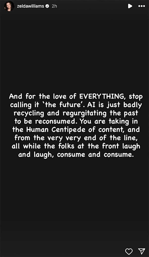 เซลดา วิลเลียมส์ (Zelda Williams ) ลูกสาวของโรบิน วิลเลียมส์ นักแสดงและผู้กำกับภาพยนตร์ชื่อดังที่เสียชีวิตในปี 2014 สุดจะทนชาวเน็ต โพสต์ข้อความลงในอินสตาแกรมสตอรี วอนยุดส่งวิดีโอที่สร้างด้วย AI ของเธอกับพ่อมาให้สักที