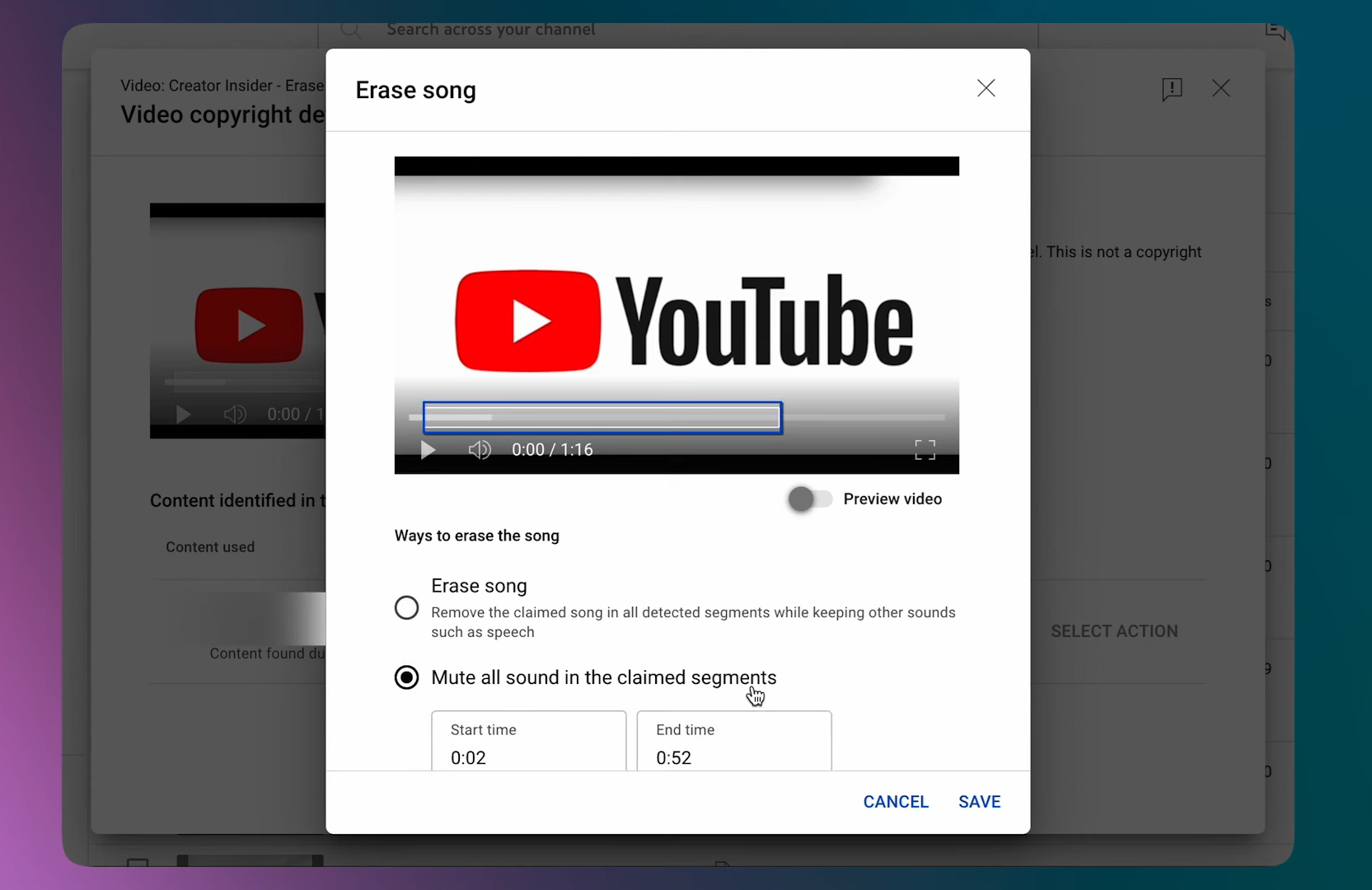 สำหรับคนที่เป็นมือใหม่นั้นมักจะแก้ปัญหาโดยการตัดคลิปช่วงที่เป็นปัญหาออกไป ซึ่งหลายคนไม่รู้ว่าใน YouTube Studio นั้นมีฟีเจอร์ Erase song ซึ่งเป็นเวอร์ชันเบต้า ช่วยปิดเสียงที่มีลิขสิทธิ์ในเนื้อหาได้ แต่ประสิทธิภาพของเครื่องมือนั้นยังไม่แม่นยำเท่าที่ควร