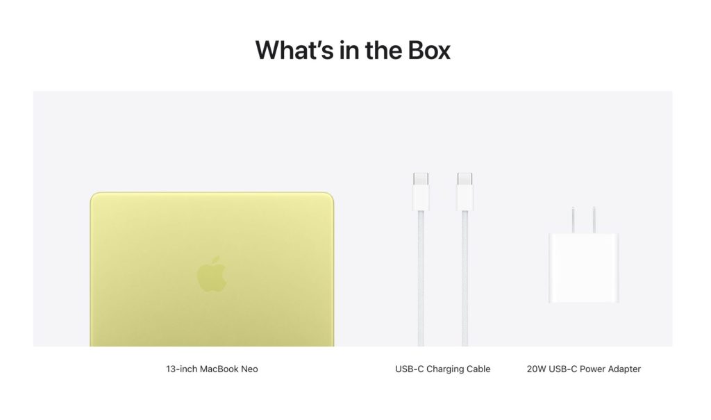 สำหรับในกล่องของ MacBook Neo ทั้ง 2 ตัวเลือกความจุมาพร้อมกับ อะแดปเตอร์แปลงไฟ USB-C ขนาด 20 วัตต์ สายชาร์จ USB‑C (1.5 ม.)