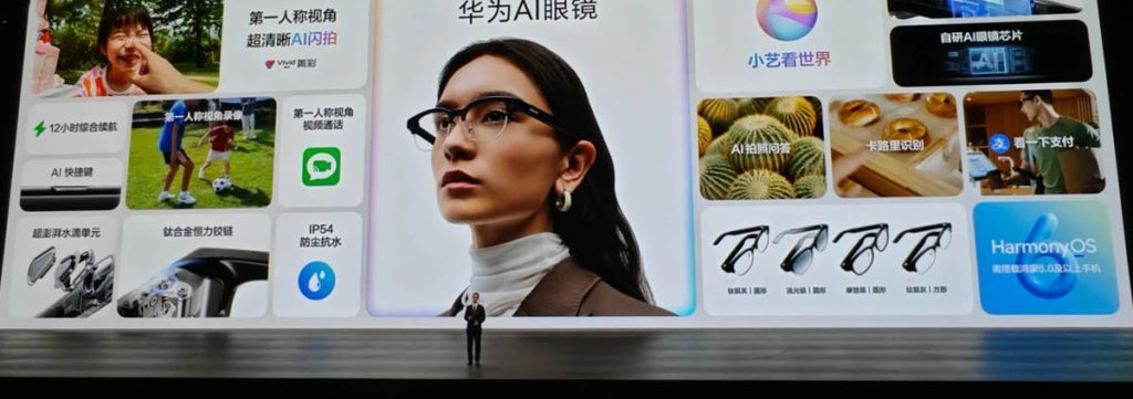 Huawei AI Glasses เป็นแว่นตาอัจฉริยะที่รูปทรงเหมือนแว่นตาทั่วไป ขับเคลื่อนด้วยชิปที่ออกแบบเองเพื่อให้มีความรวดเร็วในการประมวลผลที่สูงพอ อีกทั้งยังรองรับการเรียกใช้งานด้วยเสียง, แตะเพื่อเรียกใช้งานผู้ช่วยอัจฉริยะ Celia (AI) รวมถึงมีความสามารถในการจ่ายเงินหรือทำธุรกรรมผ่านตัวแว่นเลยด้วย