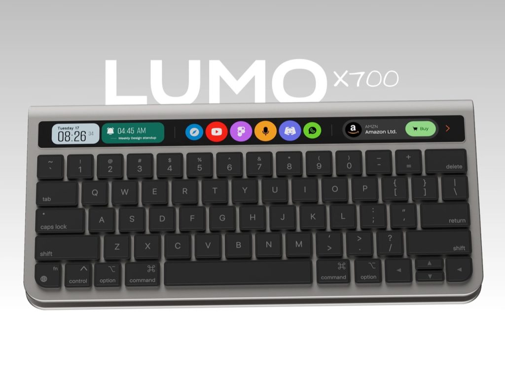 LUMO x700 คือ คีย์บอร์ดไร้สายต้นแบบที่พัฒนาโดย Eslam Mohammed และ Ahmed Yassen ดีไซน์มาในสไตล์เพรียวบางแต่เรียบหรู ใช้วัสดุโลหะคล้าย Magic Keyboard ด้านบนมาพร้อมแถบ Touch Bar ที่มีความสูงเท่ากับปุ่มปกติ พาดตามแนวยาวเพื่อให้ใช้งานได้สะดวกกว่าเดิม เราสามารถใช้งานทั้งควบคุมเพลง วิดีโอ เครื่องบันทึกเสียง หรือเลือกอีโมจิได้อย่างรวดเร็ว