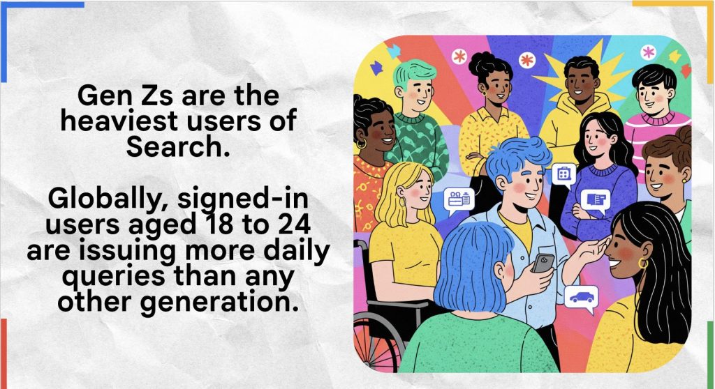 ข้อมูลล่าสุดพบว่า Gen Z (อายุ 18-24 ปี) คือ กลุ่มที่ล็อกอินเข้าสู่ระบบทั่วโลกมีการค้นหาในแต่ละวันมากกว่ากลุ่มอายุอื่นๆ สิ่งที่น่าสนใจคือ พวกเขาไม่ได้แค่ใช้การค้นหา แต่กำลัง “นิยามใหม่” ให้กับการใช้งาน โดยเน้นการค้นหาที่ลึกขึ้น นานขึ้น ใช้ภาพและเสียงมากขึ้นกว่าคนรุ่นก่อนๆ
