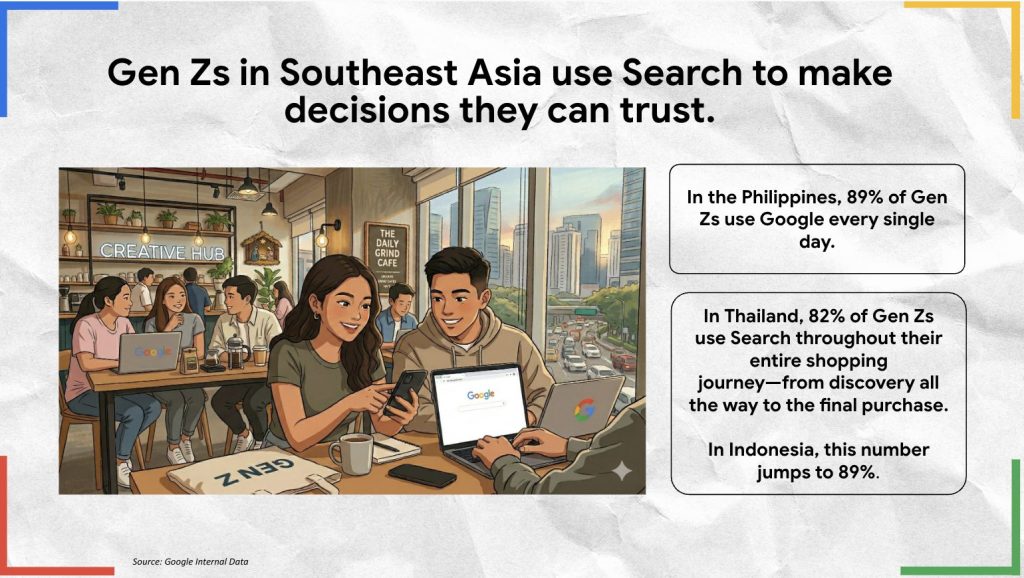 Gen Z ให้ความสำคัญกับ ความจริงใจ (Authenticity) และ การช่างเลือก (Discerning) พวกเขาไม่เชื่อถือคำโฆษณาของแบรนด์ง่ายๆ แต่จะใช้การค้นหาเป็น “ตัวกรอง” (Vetting layer) เพื่อตรวจสอบว่าความคิดเห็นที่ตรงไปตรงมา เปรียบเทียบราคาเพื่อดูว่าสินค้านั้นคุ้มค่าจิงหรือไม่ แบรนด์นั้นทำจริงตามที่พูดหรือไม่ เพราะมองว่า Search ให้ข้อมูลที่น่าเชื่อถือที่จำเป็นต่อการตัดสินใจ