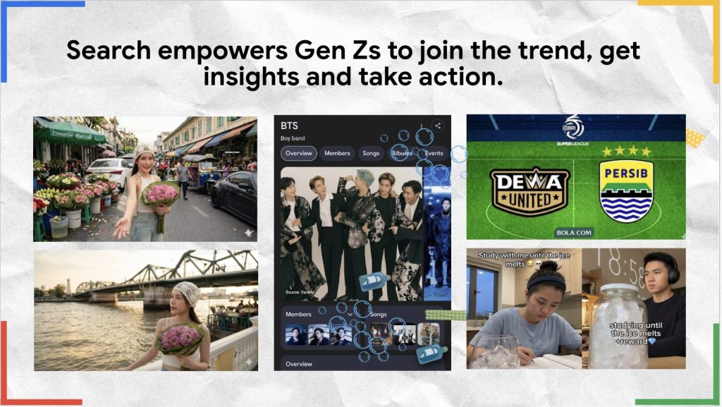 โซเชียลมีเดียอาจเป็นที่ที่ Gen Z ค้นพบเทรนด์ใหม่ๆ แต่ Search คือที่ที่พวกเขาใช้ในการค้นหาข้อมูลแบบเจาะลึกและตรวจสอบข้อเท็จจริงเกี่ยวกับเทรนด์ที่เกิดขึ้นได้ เช่น ในไทยที่เกิดเทรนด์ถ่ายรูป “ดอกบัว” ที่เป็นไวรัล โดยเริ่มจากความชื่นชอบในแฟชั่นและไลฟ์สไตล์ของ Gen Z จนนำไปสู่การค้นหาข้อมูลดอกบัวและแหล่งขายเพิ่มขึ้น 100% ส่งผลให้เกิดแรงกระเพื่อมทางเศรษฐกิจต่อธุรกิจขนาดเล็กในท้องถิ่น
