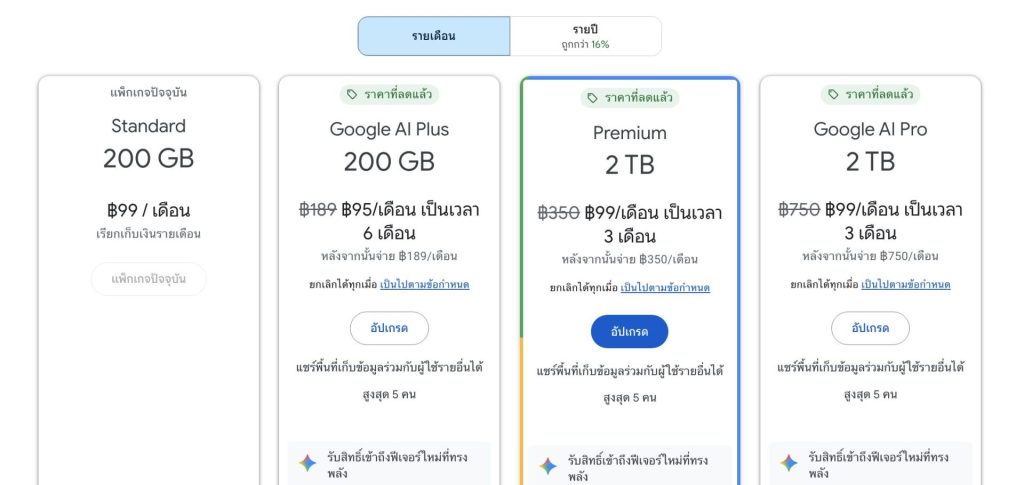 ปกติแล้ว Google จะมีพื้นที่ฟรีให้ 15 GB ถ้าใช้งานไม่พอก็แนะนำให้ซื้อบริการ Google One เพิ่มได้ ซึ่งเราจะได้พื้นที่บน Cloud เพิ่มขึ้นเป็น 200 GB โดยจะมีค่าบริการเริ่มต้นที่เดือนละ 99 บาทเท่านั้น หากเลือกแพ็คเกจที่สูงขึ้นก็จะมีสิทธิพิเศษเพิ่มเติม ตั้งแต่พื้นที่เก็บข้อมูลที่มากขึ้น การใช้งาน AI เป็น