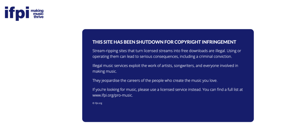 “เว็บไซต์ถูกปิดเนื่องจากละเมิดลิขสิทธิ์ เว็บริปสตรีมที่เปลี่ยนสตรีมที่มีลิขสิทธิ์ให้ดาวน์โหลดฟรีนั้นผิดกฎหมาย การใช้งานหรือดำเนินการเว็บไซต์เหล่านี้อาจนำไปสู่ผลทางกฎหมายที่ร้ายแรง รวมถึงความผิดทางอาญา”