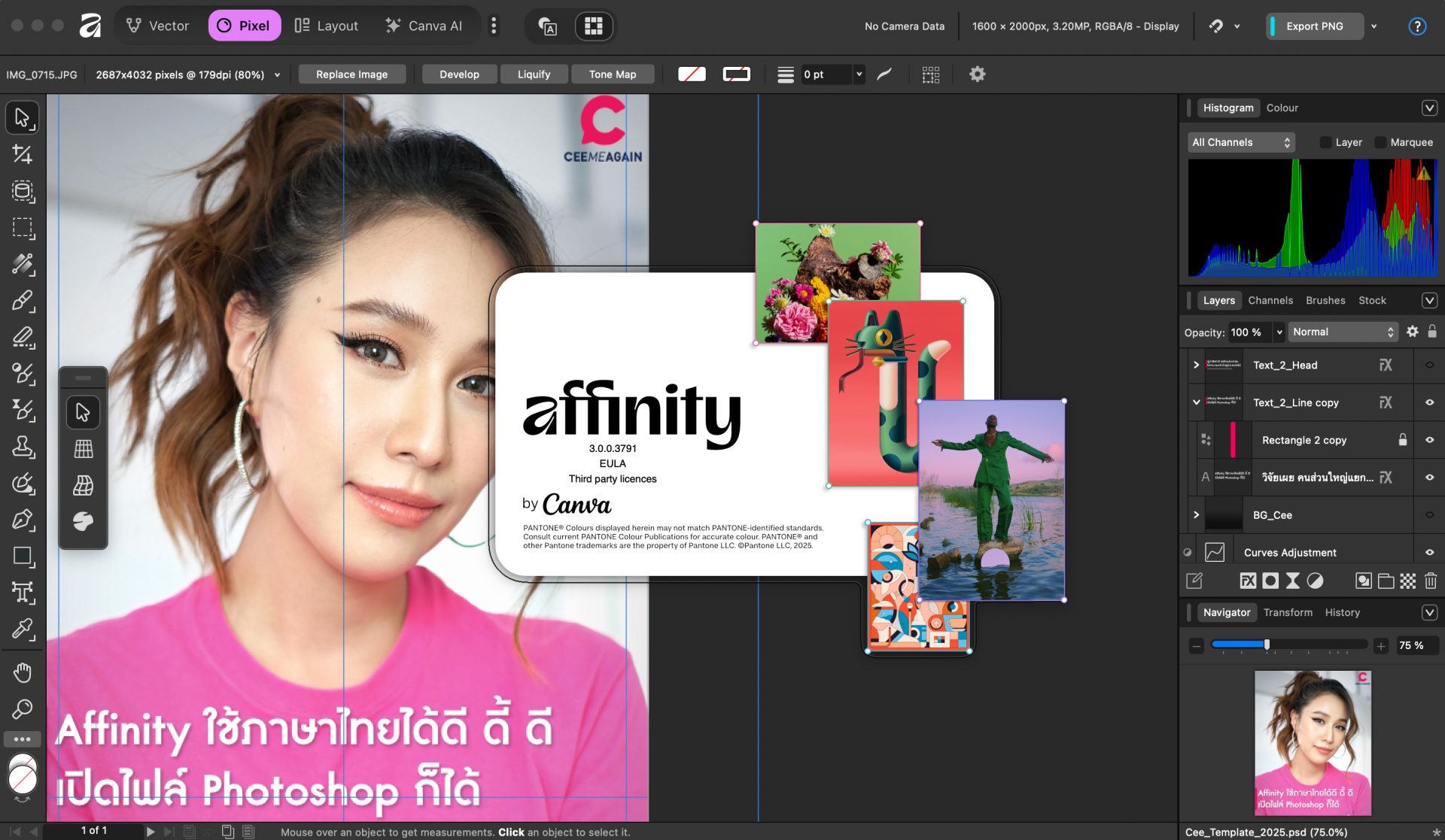 นอกจากนี้ Affinify ยังสามารถเปิดไฟล์ RAW จากกล้องได้ในตัว ทำให้สามารถปรับแต่งสีและแสงอย่างละเอียดได้ก่อนที่จะกด Develop เพื่อกลายเป็นรูปสำหรับใช้ต่อ หรือจัดการกับข้อความภาษาไทยได้ทันที ซึ่งเราเทสต์กับฟอนต์ที่ใช้ประจำ ตัววรรณยุกต์ก็นั้นไม่เด้ง