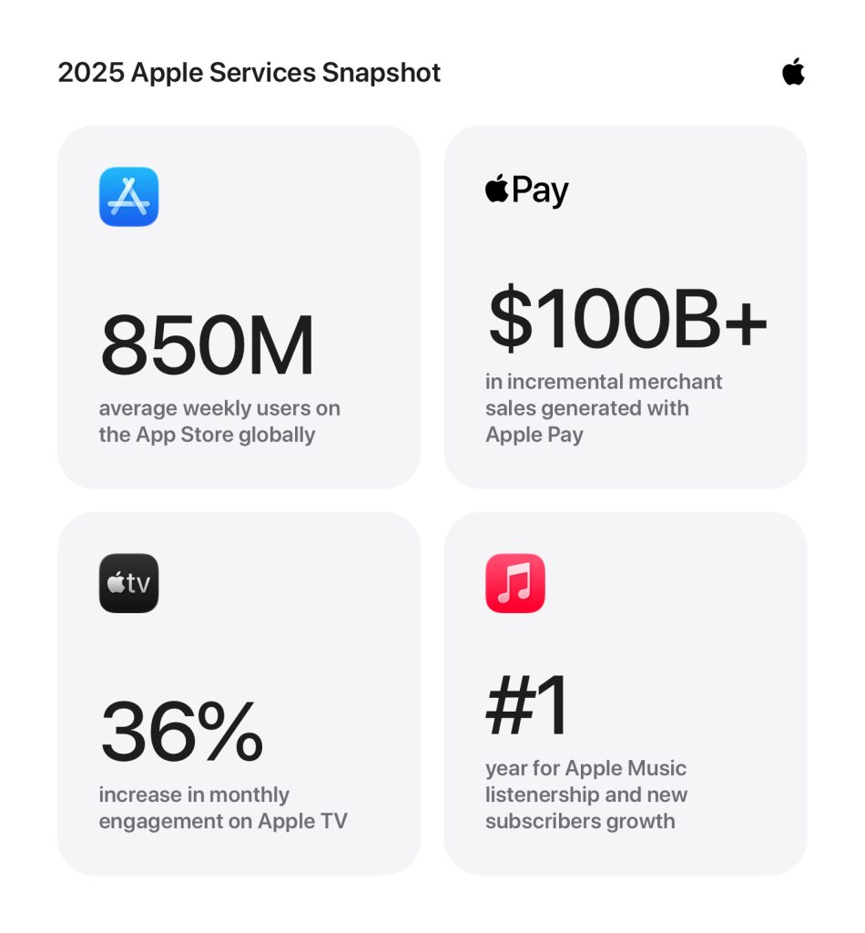 Apple ออกมาประกาศความสำเร็จในปี 2025 ที่ผ่านมาโดยระบุว่า เป็นปีแห่งการสร้างสถิติใหม่ในทุกกลุ่มบริการ (Apple Service) ตั้งแต่ App Store ไปจนถึงความบันเทิง และการชำระเงินดิจิทัล