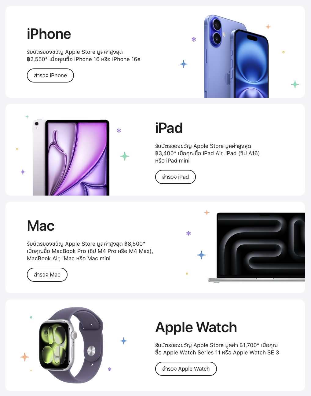 Mac: รับบัตรของขวัญ Apple Store มูลค่าสูงสุด 8,500 บาท เมื่อซื้อ MacBook Pro (ชิป M4 Pro หรือ M4 Max), MacBook Air, iMac หรือ Mac mini