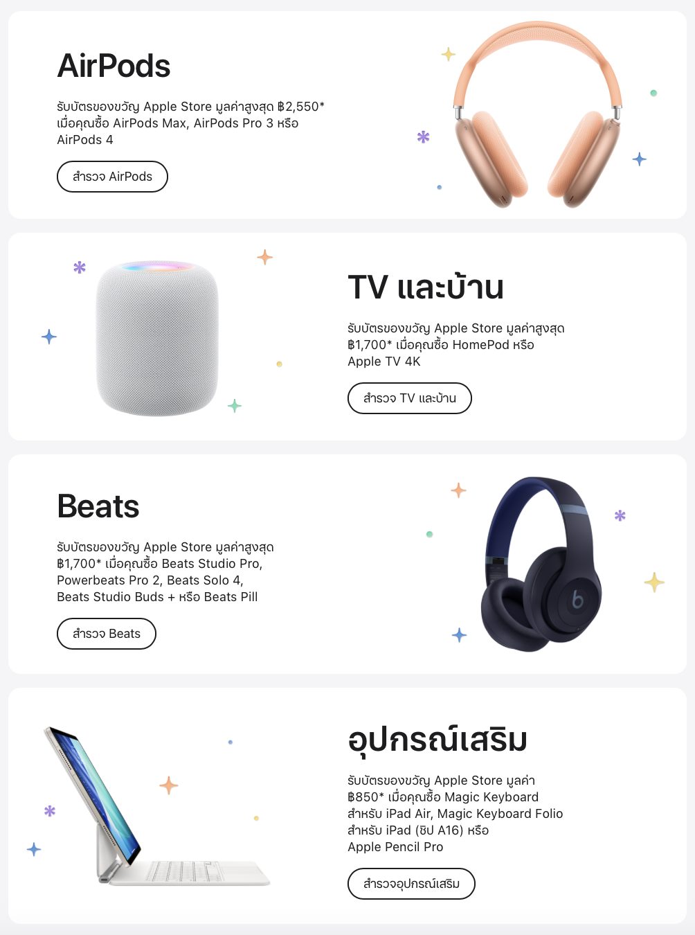 AirPods: รับบัตรของขวัญ Apple Store มูลค่าสูงสุด ฿2,550 เมื่อซื้อ AirPods Max, AirPods Pro 3 หรือ AirPods 4