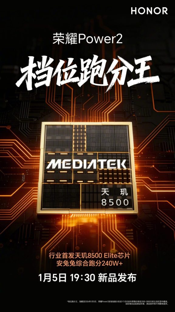 จากทีเซอร์ที่ทางบริษัทเผยมานั้น ยืนยันแล้วว่า Honor Power 2 จะมาพร้อมกับชิป MediaTek Dimensity 8500 Elite ที่สามารถทำคะแนนบน AnTuTu ได้ถึง 2.4 ล้านคะแนน เรียกว่าเป็นคะแนนที่ติดอันดับท็อปในชิปคลาสนี้เลย