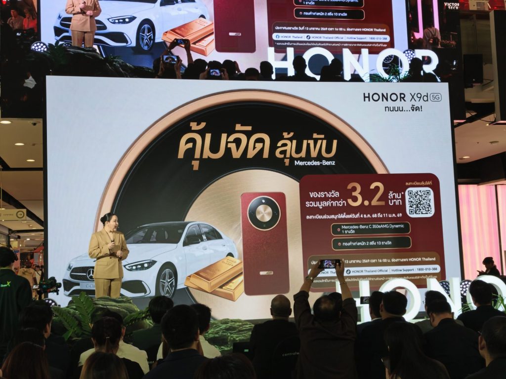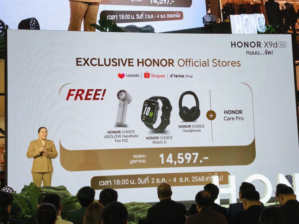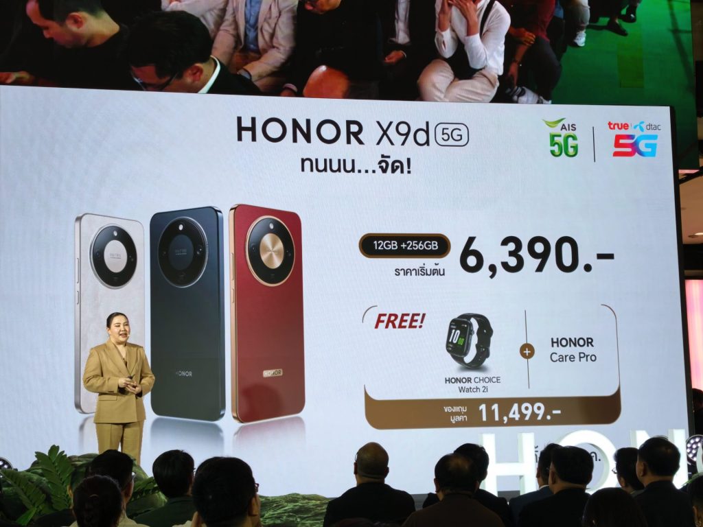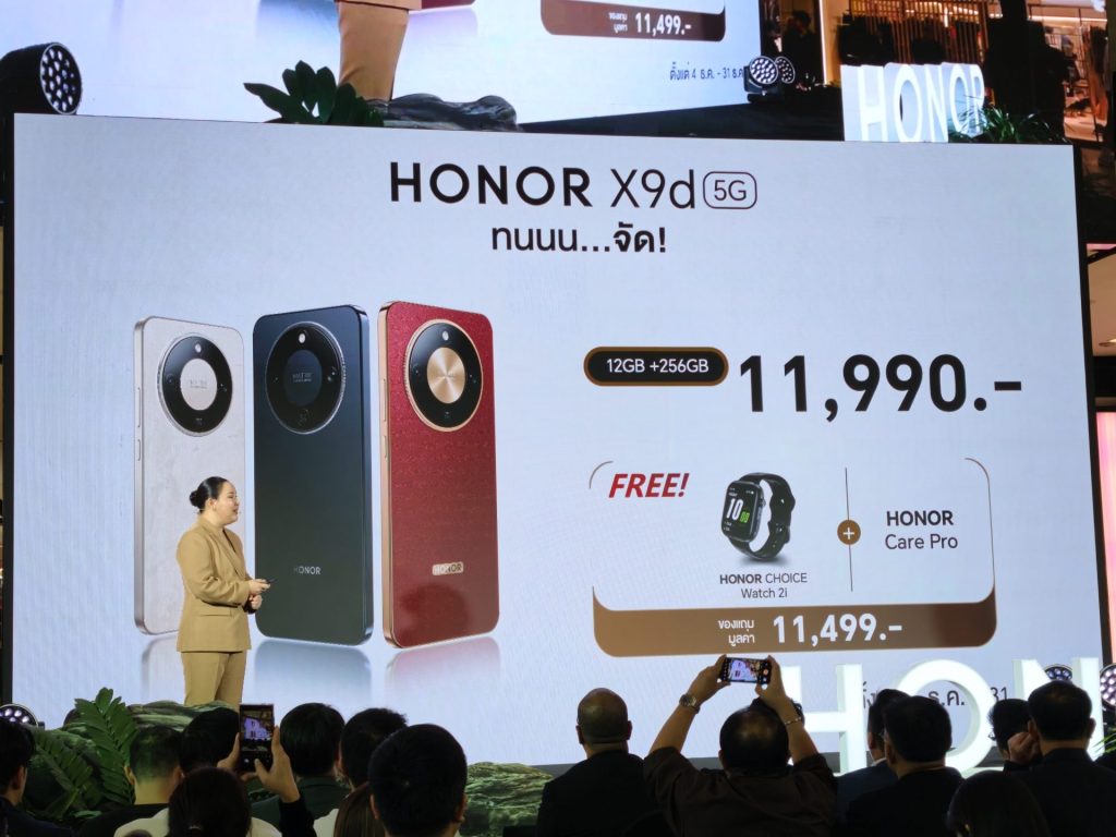 HONOR X9d 5G วางจำหน่ายในไทยแค่รุ่นความจุ 12GB + 256GB เท่านั้น ที่ราคา 11,990 บาท มีให้เลือก 3 สี ได้แก่ สีน้ำตาลแดง (Reddish Brown) สีทองประกาย (Sunrise Gold) และสีดำยามค่ำคืน (Midnight Black) โดยจะเริ่มจัดโปรโมชันตั้งแต่วันที่ 4 ธันวาคม 2568 ถึง 11 มกราคม 2569 โดยคนที่ซื้อ จะได้รับ HONOR Choice Watch 2i (มูลค่า 2,999 บาท) พร้อมประกันศูนย์ 2 ปี ประกันหน้าจอแตกและแบตเตอรี่ตามเงื่อนไข รวมถึงสิทธิ์ลุ้นรางวัลใหญ่อย่างรถยนต์ Mercedes-Benz C 350e AMG Dynamic หรือทองคำ