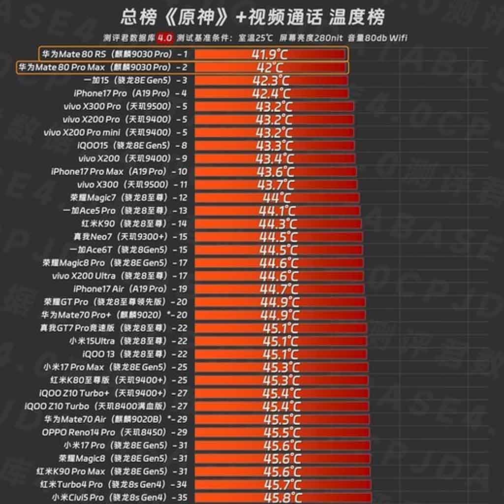 หนึ่งในจุดอ่อนสำคัญสำหรับสมาร์ตโฟนในการเล่นเกมคือความร้อน ซึ่งในการทดสอบนี้ จะทำโดยเล่นเกมพร้อมกับวิดีโอคอลไปด้วย โดยเป็นการเปรียบเทียบกับสมาร์ตโฟนเรือธงหลาย ๆ แบรนด์อย่าง iPhone 17, OnePlus 15 เป็นต้น ซึ่งสมาร์ตโฟนเหล่านี้ส่วนใหญ่จะใช้ชิป Snapdragon 8 Elite 5, MediaTek Dimensity 9500 และ Apple A17 Pro ที่ผลิตด้วยเทคโนโลยี 3nm ส่วนฝั่ง Huawei Mate 80 RS จะใช้ชิป Kirin 9030