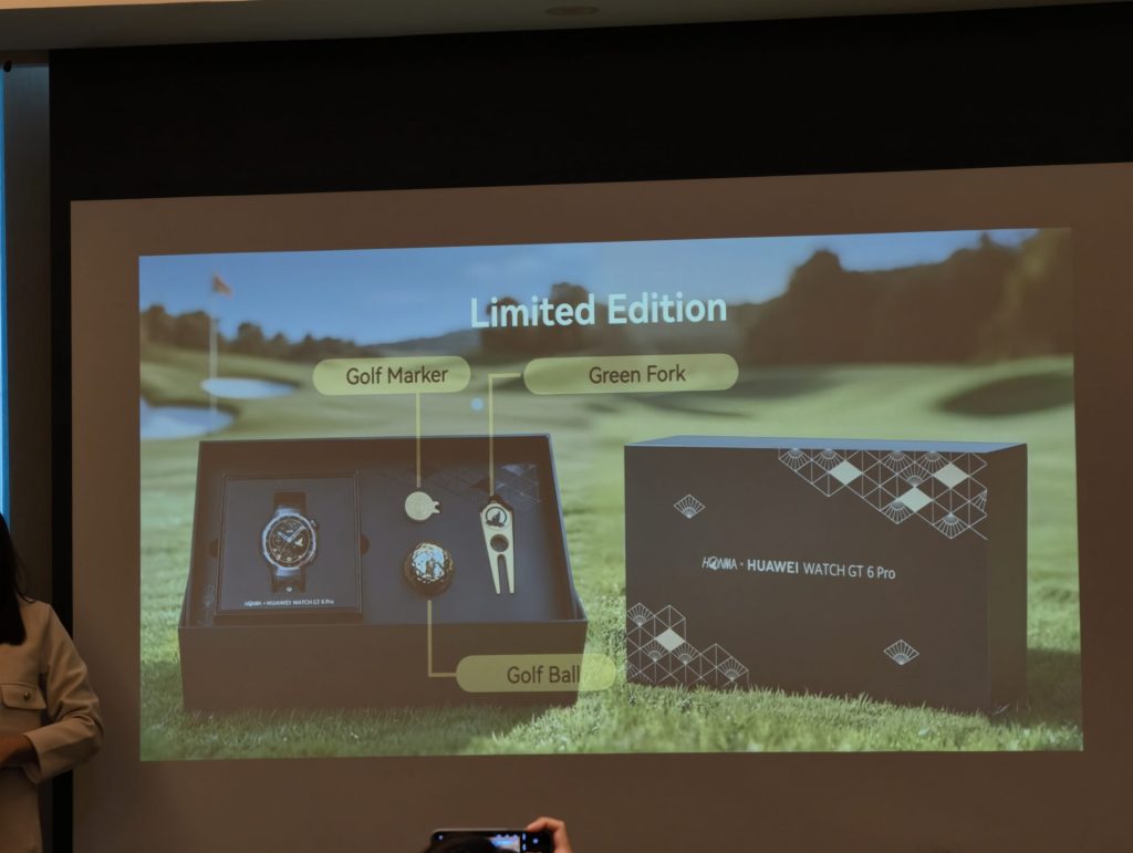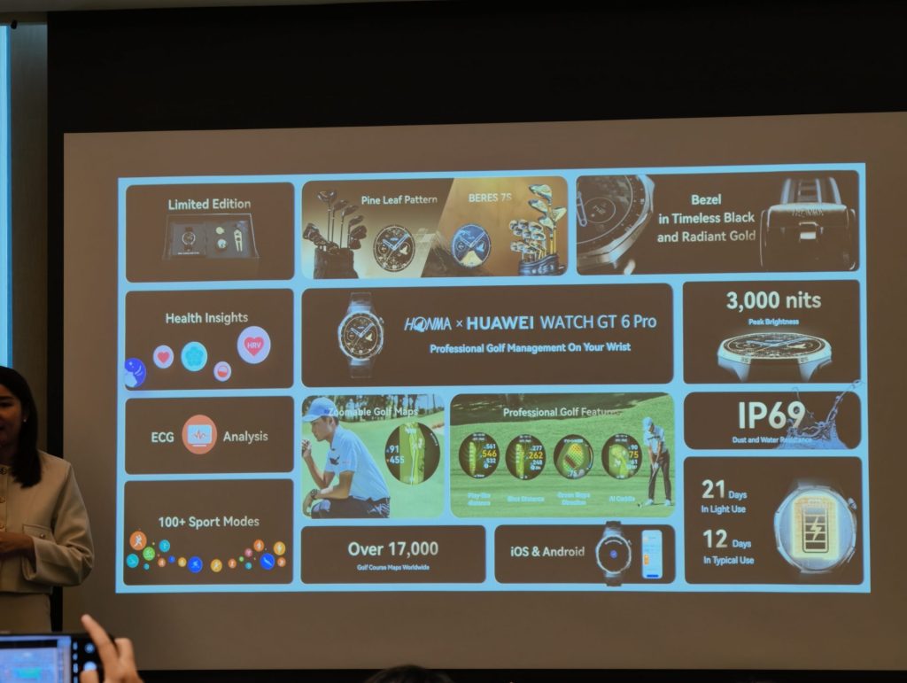 และอย่างสุดท้ายคือ HONMA x HUAWEI WATCH GT 6 Pro สมาร์ตวอทช์ที่ร่วมมือกับแบรนด์อุปกรณ์กอล์ฟ HONMA จากญี่ปุ่น โดยดีไซน์ตัวเรือนใช้โทนสี Black & Gold ที่เป็นเอกลักษณ์ของ HONMA เน้นฟังก์ชันสำหรับกีฬากอล์ฟระดับมืออาชีพ รวมถึงฟีเจอร์สุขภาพครบครัน เช่น การวัดคลื่นไฟฟ้าหัวใจ (ECG), การติดตามการนอนหลับ และ HRV Health Insights