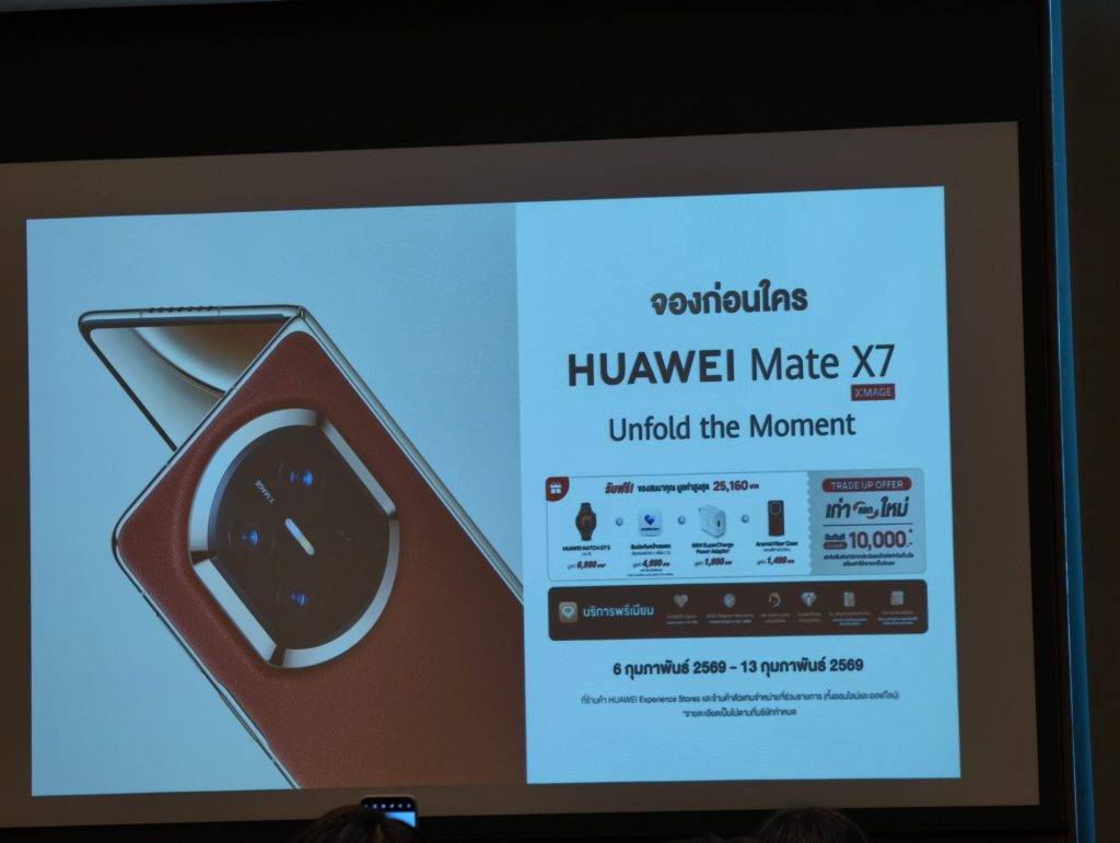 โดย HUAWEI Mate X7 จะมีให้เลือก 2 สี คือ สีแดง Nebula Red และสีดำ ซึ่งจะเปิดให้สั่งจองล่วงหน้า ตั้งแต่วันที่ 6 – 13 กุมภาพันธ์ 2569 พร้อมโปรโมชันของสมนาคุณมูลค่าสูงสุด 25,160 บาท ซึ่งประกอบด้วย HUAWEI WATCH GT 5, ประกันหน้าจอแตก HUAWEI Care+, อะแดปเตอร์ชาร์จ และเคส Aramid Fiber รวมถึงมีบริการเก่าแลกใหม่ที่ให้ส่วนลดเพิ่มสูงสุด 10,000 บาท