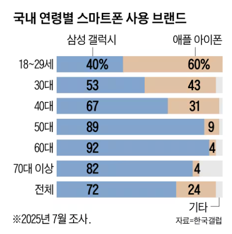 อ้างอิงจากผลสำรวจในเดือนกรกฎาคมของ Gallup Korea พบว่า ในกลุ่มผู้บริโภควัยรุ่นและคนอายุ 20 ปี หันมาใช้ iPhone มากถึง 60% ขณะที่ Galaxy ลดลงเหลือ 40% แม้ในกลุ่มอายุเกิน 30 ปี Galaxy จะยังครองส่วนแบ่งมากกว่า แต่แนวโน้มการเติบโตของ Apple ก็กดดันให้ Samsung ต้องเร่งปรับกลยุทธ์เพื่อรักษาความเป็นผู้นำตลาด