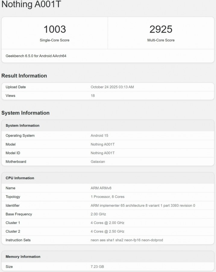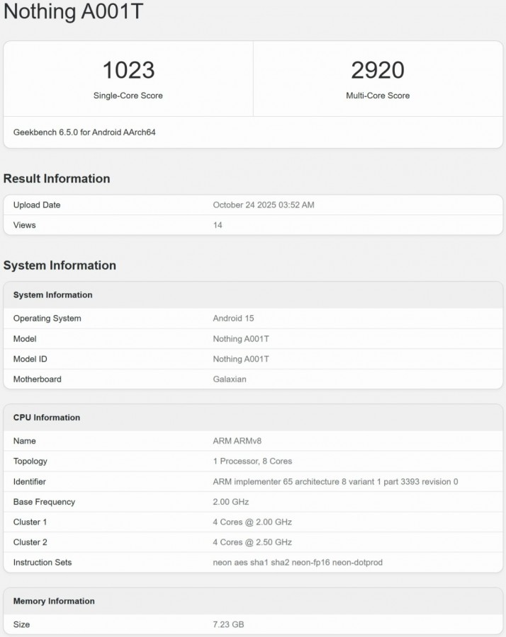 นอกจากนี้ ยังมีการค้นพบอุปกรณ์ของ Nothing ที่ใช้รหัสโมเดล A001T ซึ่งเชื่อกันว่าเป็น Phone (3a) Lite ปรากฏบนฐานข้อมูล Geekbench เผยให้เห็นสเปกที่คาดว่าจะใช้ชิปเซต Dimensity 7300, RAM 8GB และทำงานบนระบบปฏิบัติการ Android 15 โดยผลการทดสอบประสิทธิภาพทำคะแนน Single-Core ได้ประมาณ 1,003 – 1,023 คะแนน และ Multi-Core ประมาณ 2,920 – 2,925 คะแนน อีกด้วย