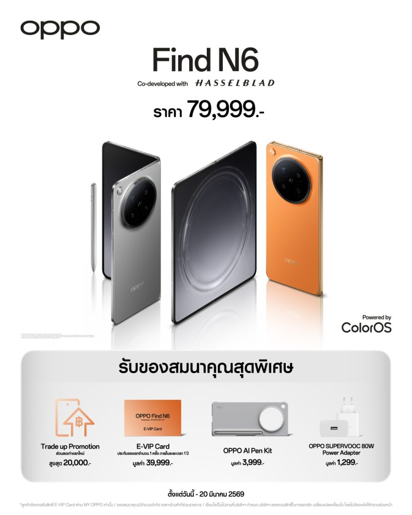 ส่วนในประเทศไทย OPPO Find N6 รุ่นความจุ 16GB+512GB เปิดราคาอยู่ที่ 79,999 บาท (วางจำหน่ายแค่ความจุเดียว) วางขายแค่สีไทเทเนียม และสีส้มทอง Blossom Orange โดยเปิดให้สั่งจองล่วงหน้าแล้วตั้งแต่วันนี้ จนถึงวันที่ 20 มีนาคม 2569 พร้อมโปรโมชันของสมนาคุณ เช่น สิทธิ์เก่าแลกใหม่ลดสูงสุด 20,000 บาท บัตร E-VIP ประกันจอแตก แถมชุดปากกา OPPO AI Pen Kit และอะแดปเตอร์ชาร์จไว 80W รวมมูลค่าประมาณ 45,000 บาท โดยผู้ที่สั่งจอง จะสามารถรับเครื่องได้ตั้งแต่วันที่ 21 มีนาคม 2569 เป็นต้นไป