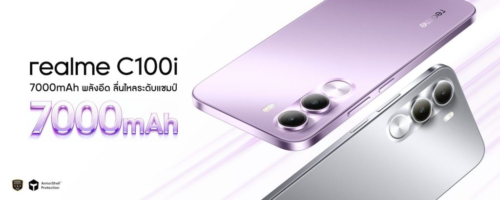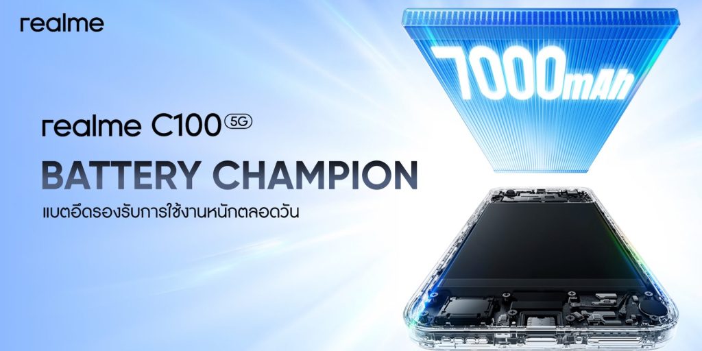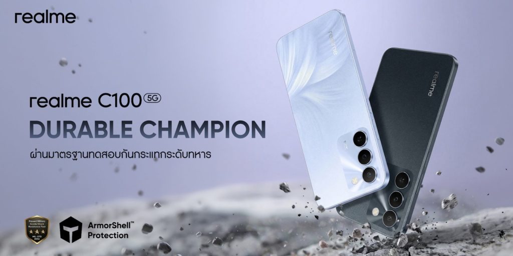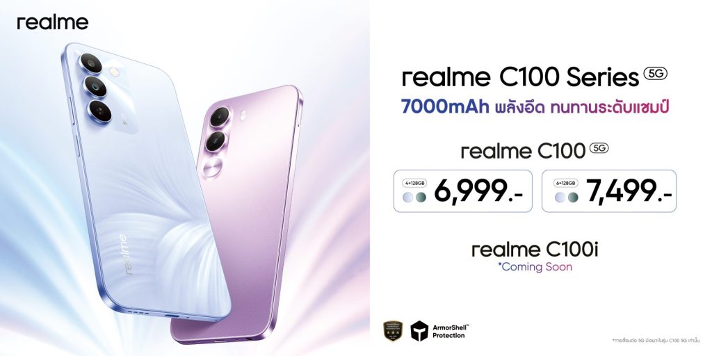 realme ประเทศไทย ประกาศเปิดตัวสมาร์ตโฟนระดับเริ่มต้นรุ่นใหม่ในตระกูล C100 Series ได้แก่ realme C100 5G และ C100i โดยมุ่งเน้นเจาะกลุ่มผู้ใช้งาน ที่ต้องการอุปกรณ์สเปกครบครัน ชูจุดเด่นด้านความทนทานและแบตเตอรี่ขนาดใหญ่ 7000mAh ในราคาเริ่มต้นระดับหลักพัน
