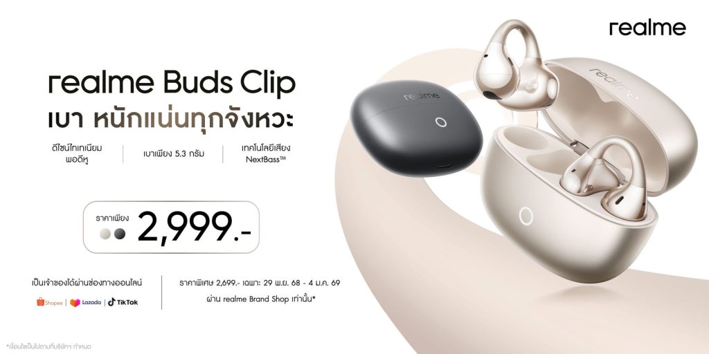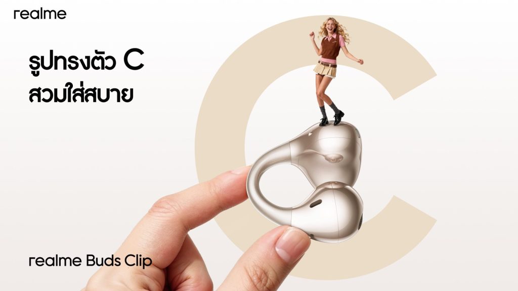 นอกจากนี้ realme ยังเปิดตัว realme Buds Clip ซึ่งเป็นหูฟังดีไซน์แบบคลิปเน้นการสวมใส่ที่มั่นคงและเบาสบายสำหรับการใช้งานระยะยาว ตัวหูฟังมีน้ำหนักเพียงข้างละ 5.3 กรัม พร้อมโครงสร้างแบบหนีบหูที่ออกแบบตามหลักสรีรศาสตร์ รองรับการใช้งานในกิจกรรมต่าง ๆ และใช้ระบบเสียง NextBass ที่พัฒนาโดย realme เอง พร้อมไมโครโฟนคู่และเทคโนโลยี AI ENC ช่วยลดเสียงรบกวนระหว่างการสนทนา