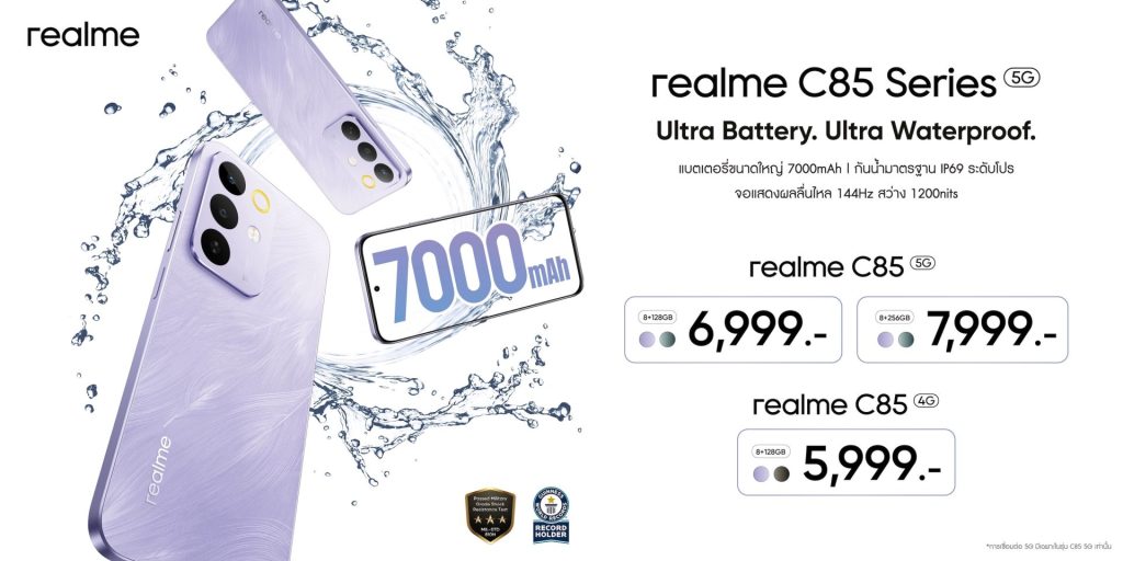 realme เปิดตัว realme C85 Series 5G และ 4G ในประเทศไทยอย่างเป็นทางการ มาพร้อมแบตเตอรี่ 7000mAh และเทคโนโลยีกันน้ำ IP69 Pro ในราคาเริ่มต้น 5,999 บาท พร้อมเปิดตัวหูฟัง realme Buds Clip และเริ่มวางจำหน่ายตั้งแต่วันที่ 28 พฤศจิกายนเป็นต้นไป