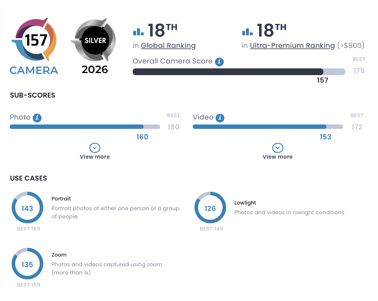 การที่คะแนนของ Samsung Galaxy S26 Ultra จะไม่ได้เพิ่มมากมายนัก เพราะ Samsung ยังคงใช้กล้อง Ultrawide ความละเอียด 50 ล้านพิกเซล f/1.9 พร้อมเซ็นเซอร์ขนาด 1/2.5 นิ้ว และกล้อง Telephoto ความละเอียด 10 ล้านพิกเซล f/2.4 ซูม 3 เท่า พร้อมเซ็นเซอร์ขนาด 1/3.52 นิ้ว เหมือนกับใน Galaxy S25 Ultra ส่วนกล้องหลักความละเอียด 200 ล้านพิกเซ พร้อมเซ็นเซอร์ขนาด 1/1.3 นิ้ว มีรูรับแสงที่สว่างขึ้นเป็น f/1.4 จาก f/1.7 ส่วนกล้อง Periscope ความละเอียด 50 ล้านพิกเซ,พร้อมเซ็นเซอร์ขนาด 1/2.52 นิ้ว มีรับแสงที่กว้าขึ้นจาก f/3.4 เป็น f/2.9