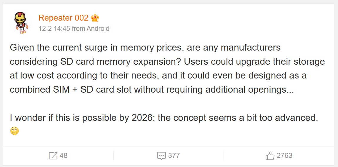 อย่างไรก็ตาม สถานการณ์กำลังเปลี่ยนไปเนื่องจากราคาของ DRAM กำลังพุ่งขึ้นอย่างต่อเนื่องจนกลายเป็นปัญหาของผู้บริโภค และปัญหาของผู้ผลิตสมาร์ตโฟนเช่นเดียวกัน โดย ผู้ใช้งาน Weibo ชื่อ Repeater 002 ระบุว่าซัปพลายเออร์ภายในประเทศจีนมีแผนที่จะนำ microSD กลับมาใช้ในสมาร์ตโฟน สาเหตุเกิดปัญหาขาดแคลน DRAM ที่มีแนวโน้มว่าจะยืดเยื้อไปจนถึงไตรมาสที่ 4 ปี 2027 และส่งผลกระทบต่ออุตสาหกรรมสมาร์ตโฟนแบบหลีกเลี่ยงไม่ได้