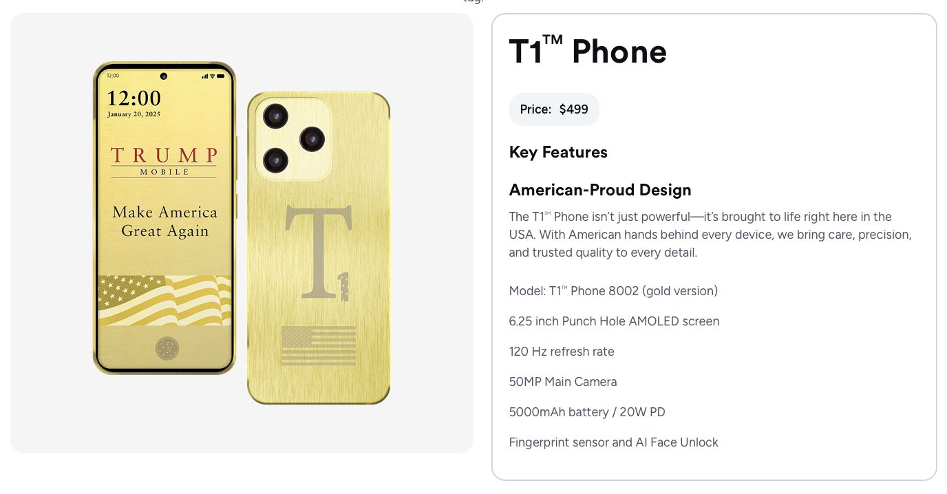 Trump T1 Phone เปิดตตัวเมื่อเดือนมิถุนายนที่ผ่านมาพร้อมกับแพ็กเกจรายเดือนราคา 47.45 เหรียญหรือประมาณ 1,540 บาทต่อเดือน แต่กำหนดการวางจำหน่ายนั้นยังไม่มีความแน่นอนมาอยู่แล้ว Trump Organization ระบุว่าจะวางจำหน่ายในเดือนสิงหาคม แต่หน้าเว็บไซต์ระบุไว้เป็นเดือนกันยายน แต่สุดท้ายก็ยังไม่ได้นำออกมาจำหน่ายจริง ๆ เสียที