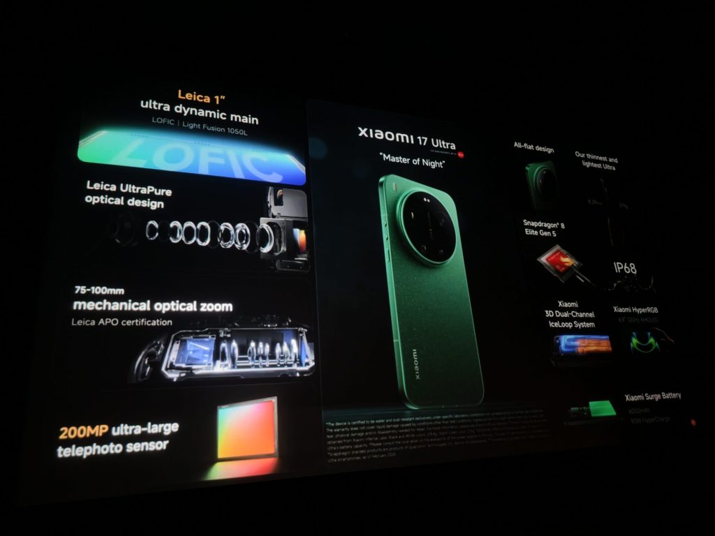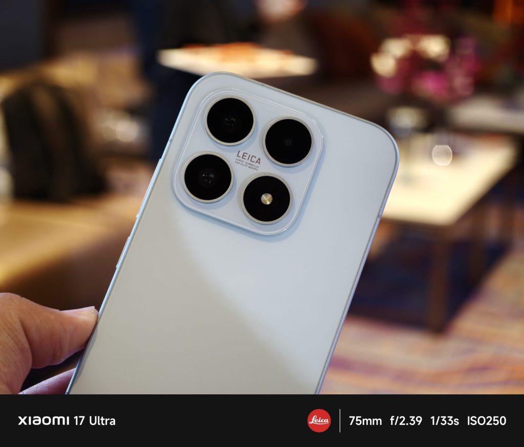 สำหรับรุ่นท็อปอย่าง Xiaomi 17 Ultra นั้น มาพร้อมกล้องถ่ายภาพหลัก Leica Ultra Dynamic ความละเอียด 50 ล้านพิกเซล ที่ใช้เซนเซอร์ขนาด 1 นิ้ว รุ่น Light Fusion 1050L ทำงานร่วมกับเทคโนโลยี LOFIC HDR ที่ช่วยเพิ่มความกว้างของไดนามิกเรนจ์ ทำให้สามารถเก็บรายละเอียดภาพและสีสันได้สมจริงยิ่งขึ้นในสภาวะแสงต่าง ๆ โดยโครงสร้างเลนส์ในกล้องถ่ายภาพหลัก ใช้การออกแบบ Optical Leica UltraPure แบบไฮบริด 1G+6P พร้อมกระบวนการเคลือบเลนส์หลายชั้นเพื่อลดการหักเหของแสงและภาพซ้อน