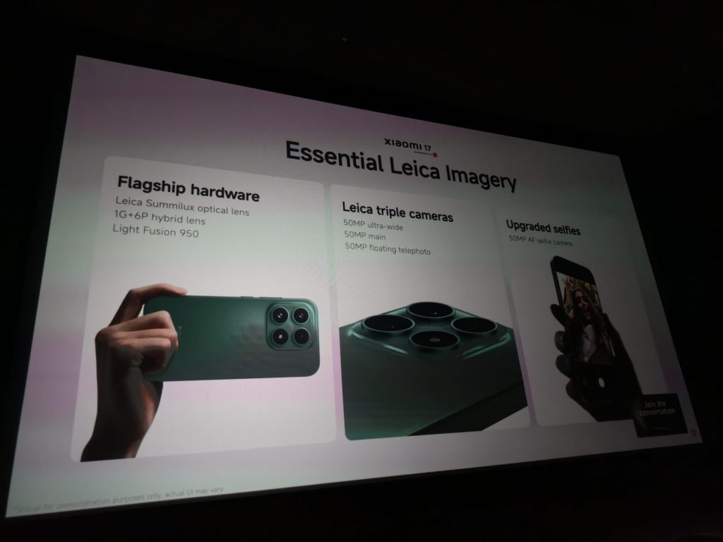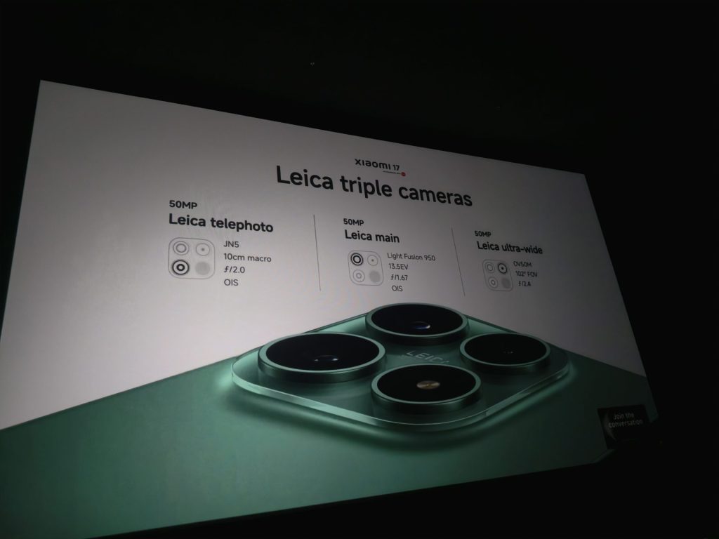 ขณะที่รุ่น Xiaomi 17 ถูกวางตำแหน่งให้เป็นสมาร์ตโฟนขนาดพกพา ที่เน้นประสิทธิภาพด้านการถ่ายภาพ รุ่นนี้มาพร้อมกล้องถ่ายภาพเลนส์ออปติคัล Leica Summilux โดยกล้องถ่ายภาพหลัก ให้ความละเอียด 50 ล้านพิกเซล รูรับแสง f/1.67 และเซนเซอร์ Light Fusion 950 ขนาด 1/1.31 นิ้ว ที่ให้ไดนามิกเรนจ์สูง 13.5EV พร้อมกล้องเทเลโฟโต้แบบลอยตัว ความละเอียด 50 ล้านพิกเซล ระยะ 60 มิลลิเมตร ที่รองรับการถ่ายภาพมาโครในระยะใกล้สุด 10 เซนติเมตร, กล้องถ่ายภาพมุมกว้างมาก 50 ล้านพิกเซล 102 องศา และกล้องหน้า 50 ล้านพิกเซล
