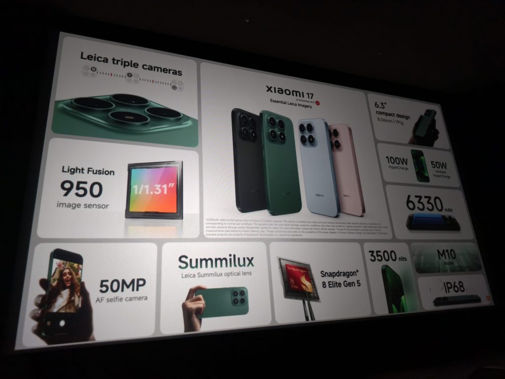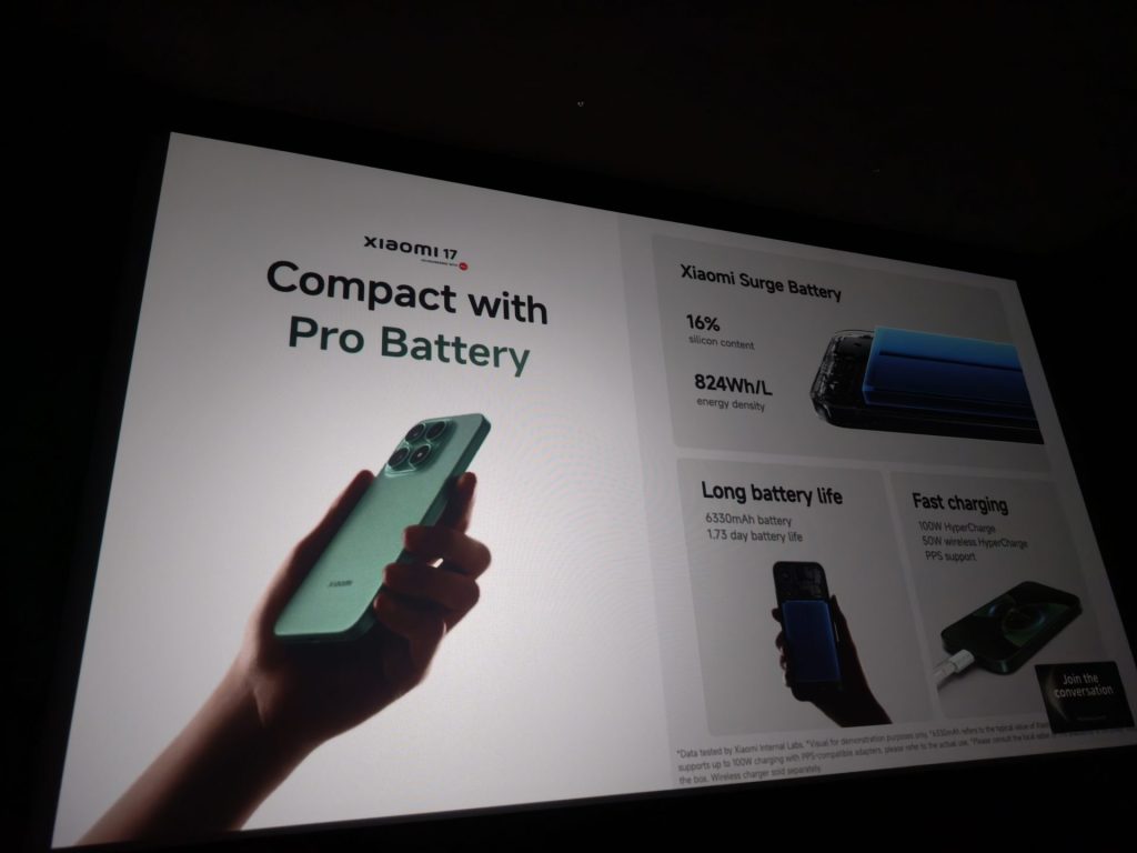 ด้านสเปกภายใน แม้จะมีขนาดกะทัดรัด แต่ Xiaomi 17 มาพร้อมแบตเตอรี่ซิลิคอน-คาร์บอนความจุ 6,330 mAh รองรับการชาร์จเร็วแบบใช้สาย 100W ที่รองรับ PPS เหมือนกัน และชาร์จไร้สายได้ 50W และขับเคลื่อนด้วยชิปเซต Snapdragon 8 Elite Gen 5 เช่นเดียวกัน