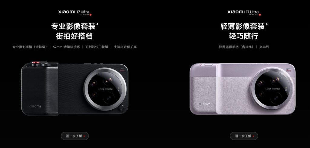 โดย Xiaomi ได้ออก Xiaomi 17 Ultra Professional Imaging Kit ที่เป็นชุดกริปมาวางจำหน่าย 2 แบบ 2 สีด้วยกัน โดยสีดำ จะเป็น Professional Imaging Kit ที่เป็นกริปไซซ์ใหญ่ มีปุ่มกดแบบที่เคยเห็นใน Xiaomi 15 Ultra ในขณะที่ สีม่วง จะเป็น ‘Slim and Lightweight Imaging Kit’ ที่เป็นชุดกริปขนาดเล็ก ที่พกพาง่ายกว่าให้เลือกซื้อด้วย