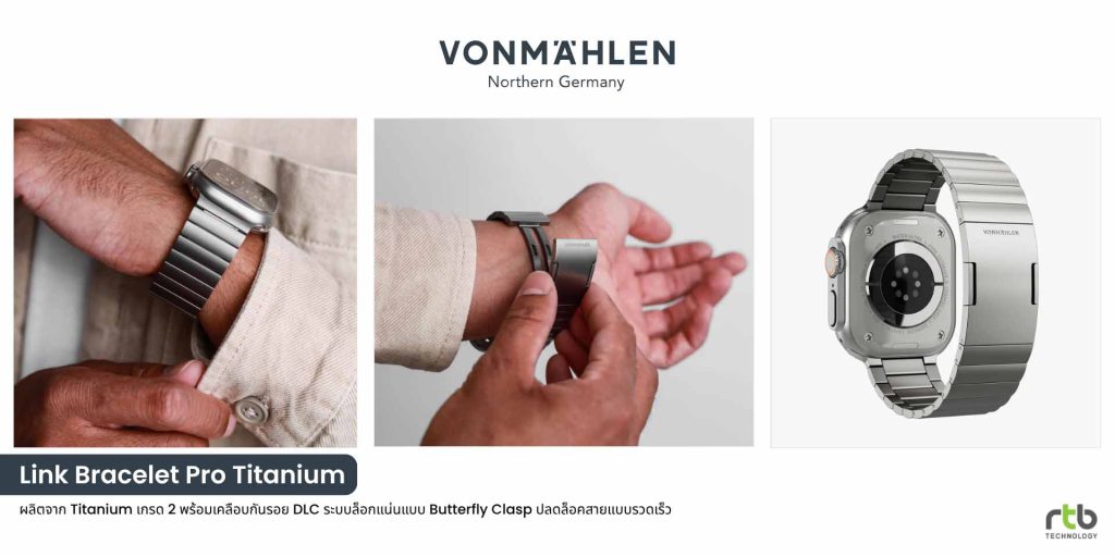 - VONMÄHLEN Link Bracelet Pro Titanium (ราคา 6,990 บาท): สายระดับพรีเมียมผลิตจากไทเทเนียมเกรด 2 ผสมวัสดุรีไซเคิล 25% น้ำหนักเบา ทนทานต่อการกัดกร่อน ตัวสายเคลือบ Diamond-Like Carbon (DLC) ป้องกันรอยขีดข่วนและการสึกหรอ มีให้เลือก 2 สี ได้แก่ Black และ Natural รองรับหน้าปัดขนาด 44-49mm