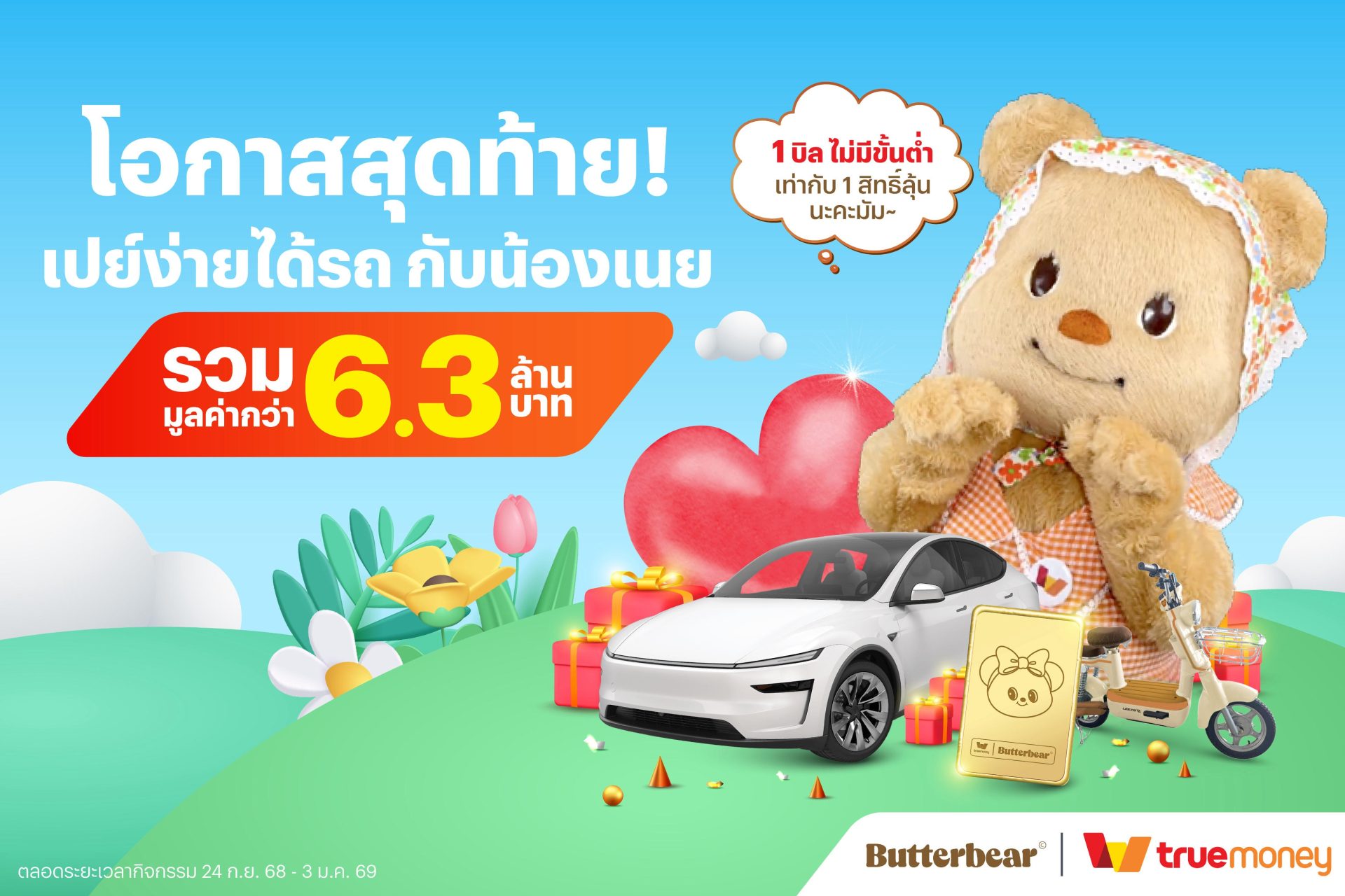ทรูมันนี่ (TrueMoney) ประกาศจัดแคมเปญใหญ่ส่งท้ายปีเอาใจสายเปย์และเหล่าแฟนคลับ “น้องเนย” (Butterbear) ไอดอลสาวขวัญใจมหาชน กับแคมเปญ “เปย์ง่ายได้รถ Butterbear” ขนทัพของรางวัลสุดพรีเมียมรวมมูลค่ากว่า 6.3 ล้านบาท มาคืนกำไรให้ลูกค้า เพียงใช้จ่ายผ่านแอปพลิเคชันทรูมันนี่