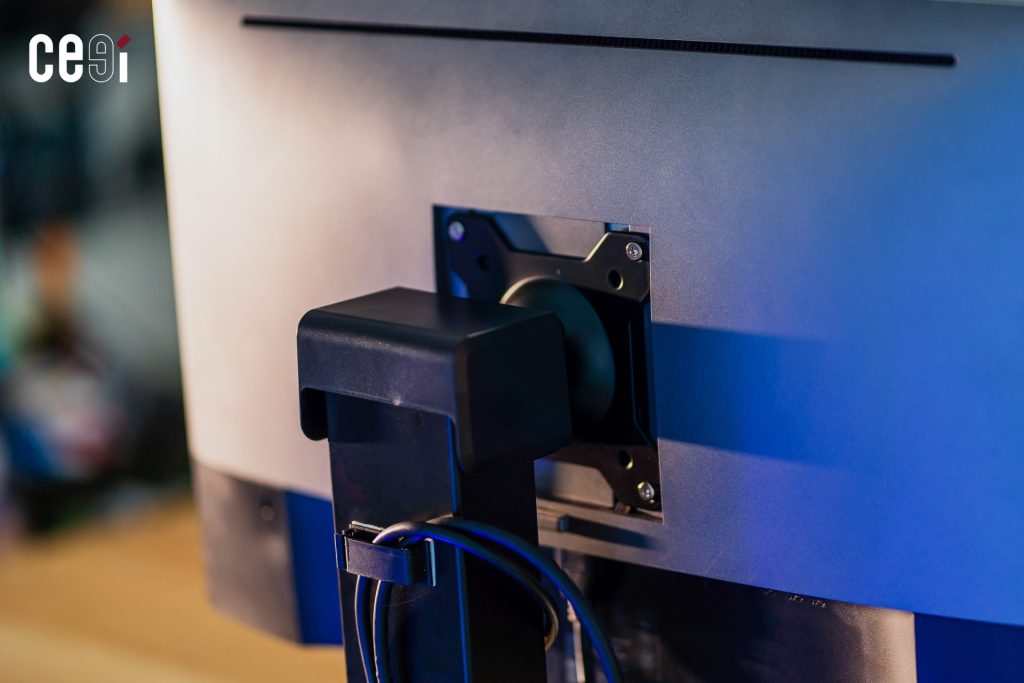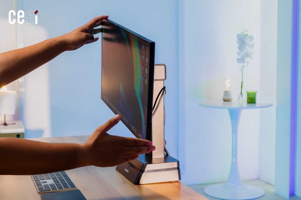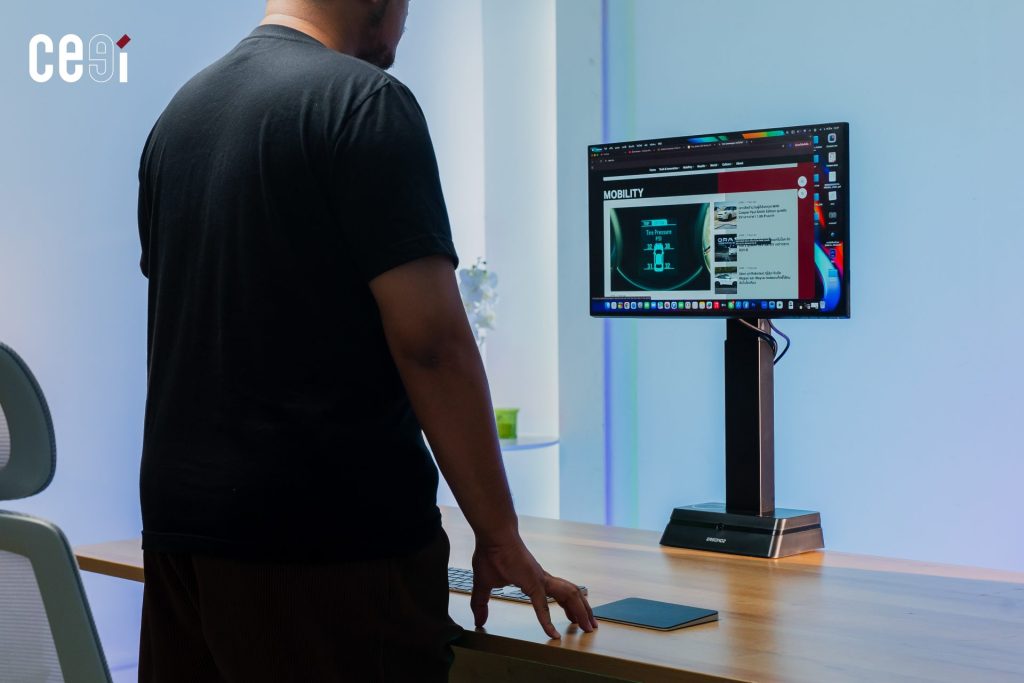 จากนั้น ระบบจะสั่งการให้มอเตอร์ปรับระดับความสูงของหน้าจอ (ในช่วงระยะ 33.6 – 54.6 เซนติเมตร) โดยเลื่อนขึ้น หรือลงให้ขนานกับระดับสายตาของผู้ใช้โดยอัตโนมัติ ฟีเจอร์นี้ จะช่วยแก้ปัญหาเรื่องความขี้เกียจเอื้อมมือไปปรับจอด้วยตัวเอง และช่วยบังคับสรีระช่วงคอให้อยู่ในระนาบที่ถูกต้องตลอดเวลาเพื่อลดความเมื่อยล้าได้แบบอัตโนมัติเลย