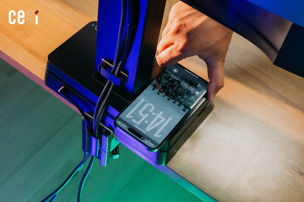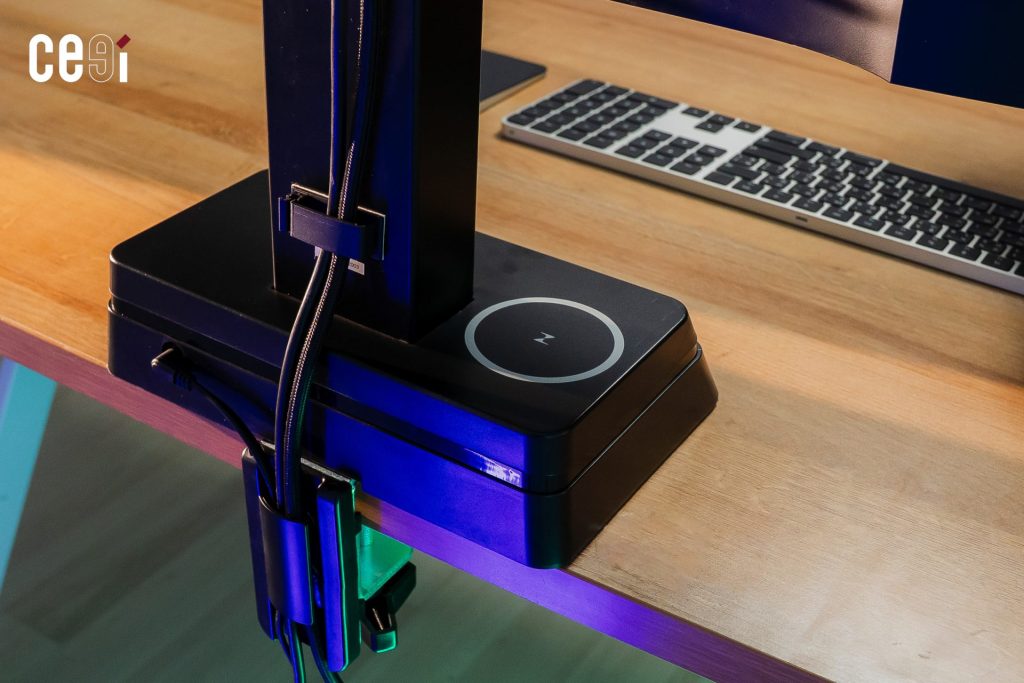 นอกจากระบบปรับระดับอัตโนมัติแล้ว บริเวณฐานของ Eye-Traxer ยังมีการติดตั้งแท่นชาร์จไร้สายมาให้ในตัว ช่วยลดความยุ่งยากของการใช้สายชาร์จสมาร์ตโฟนบนโต๊ะทำงาน และยังมีช่องจัดเก็บสายไฟที่ออกแบบมาให้ซ่อนสายเคเบิลต่าง ๆ ได้อย่างเป็นระเบียบมากขึ้นได้ด้วย