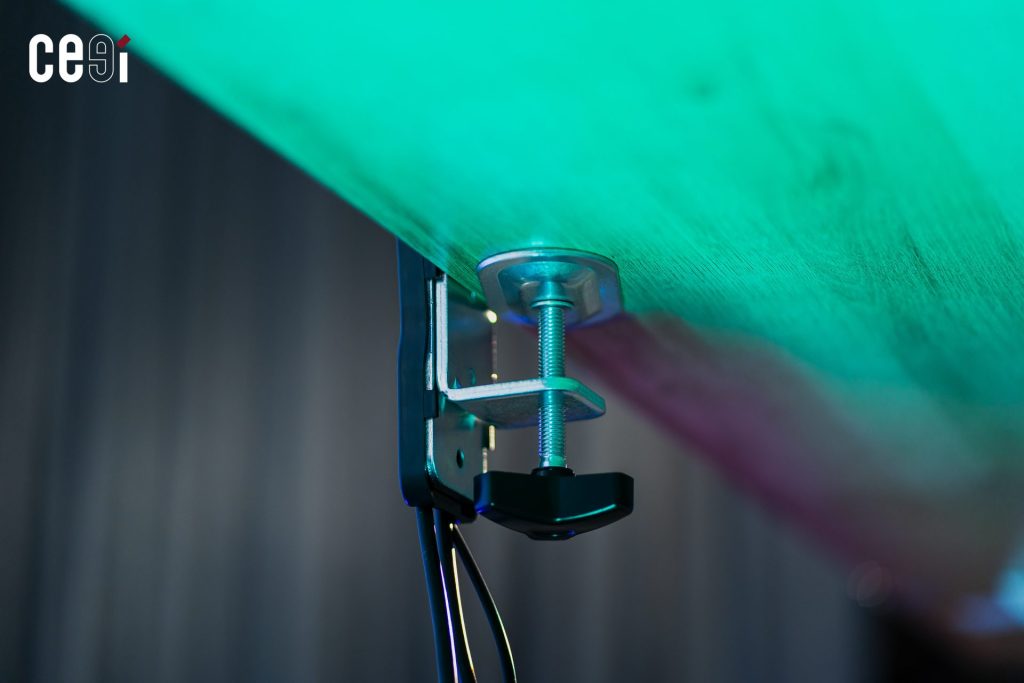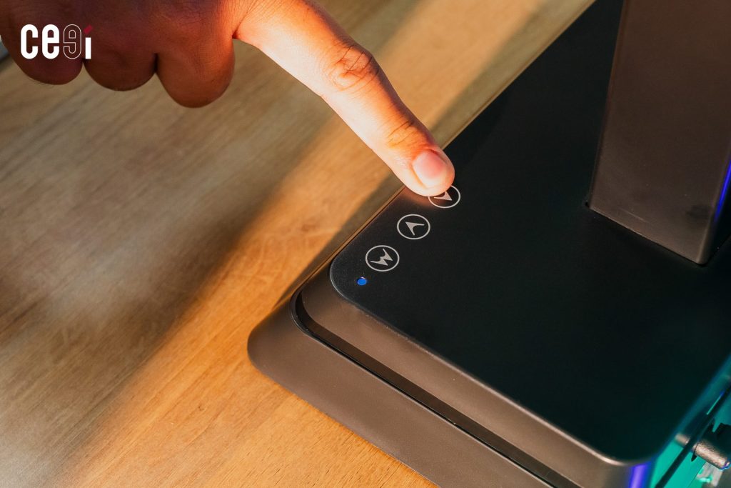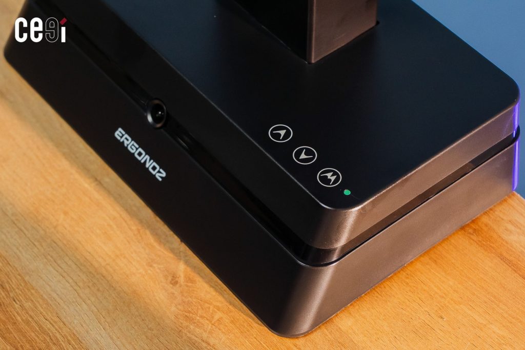 นอกจากนั้น ที่ฐานของแขนจับจอ Ergonoz Eye-Traxer ยังมีปุ่มสำหรับปรับความสูง – ต่ำของแขนจับให้เป็นระดับที่เราต้องการเองได้ด้วย สำหรับใครที่อยากปรับความสูงของจอให้เป็นระดับที่เราอยากได้เพิ่มเติม โดยไม่ต้องพึ่งแค่ฟีเจอร์ Face Tracking เพียงอย่างเดียว