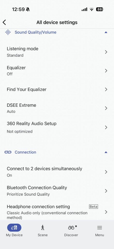 ส่วนแอป Sound Connect ก็ใช้ควบคุมหูฟังได้มากมายเช่นเคย ซึ่งเราจะให้เป็นชื่อฟังก์ชันภาษาอังกฤษไว้นะครับ ถ้าสนใจปรับเรื่องไหนก็เข้าไปดูในหน้า Device Settings เพื่อปรับได้