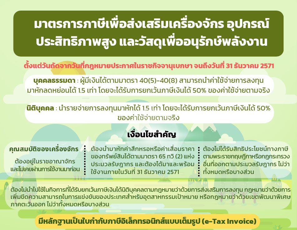 สำหรับบุคคลธรรมดา (เงินได้ ม.40 (5)-(8)) และนิติบุคคล สามารถนำค่าใช้จ่ายที่ลงทุนในเครื่องจักร/อุปกรณ์ประสิทธิภาพสูง หรืออุปกรณ์อนุรักษ์พลังงานที่ได้ฉลากประสิทธิภาพระดับ 5 ดาว ยกเว้นภาษี 50% ของรายจ่าย