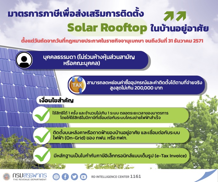 สำหรับ บุคคลธรรมดา สามารถหักลดหย่อนตามที่จ่ายจริง แต่ไม่เกิน 200,000 บาท ครอบคลุมค่าซื้ออุปกรณ์และค่าติดตั้งระบบโซลาร์เซลล์แบบ on-grid (ติดแบตเพิ่มได้) บนหลังคา/อาคารที่อยู่อาศัย