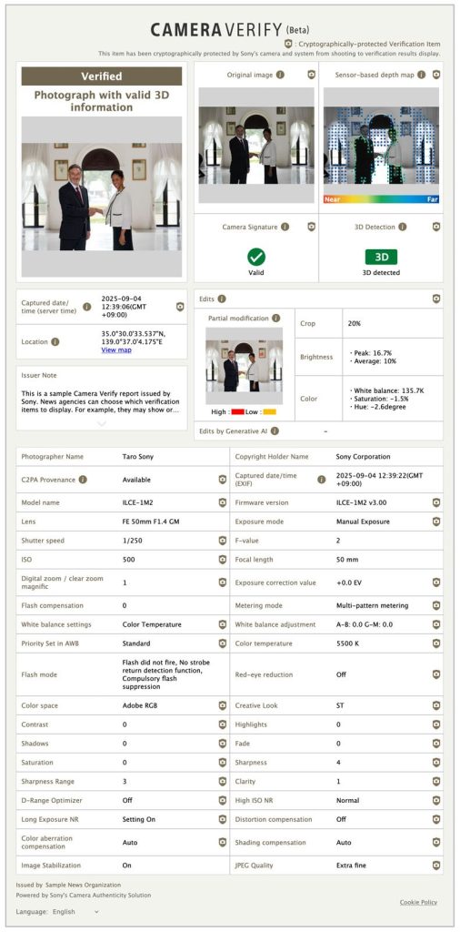 นอกจากนั้นผู้ใช้ยังสามารถใช้เว็บไซต์ตรวจสอบความถูกต้องของโซนี่เพื่อยืนยันได้ว่า ภาพนิ่งหรือวิดีโอที่บันทึกมานั้นถ่ายมาจากกล้อง Sony ที่ได้รับการรับรอง ไม่ได้ถูกสร้างขึ้นด้วย AI